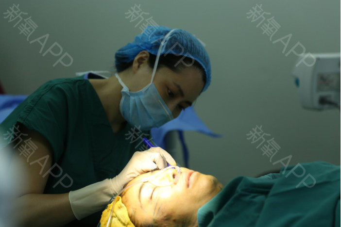 将患者面部额部两个部位,苹果肌两个部位,太阳穴两个部位,颧弓下两个部位,眼周部位,下巴两个部位,前面颊两个部位,侧面颊两个部位进行埋线精雕以达到提拉紧致的目的,将额部两边部位进行脂肪填充。