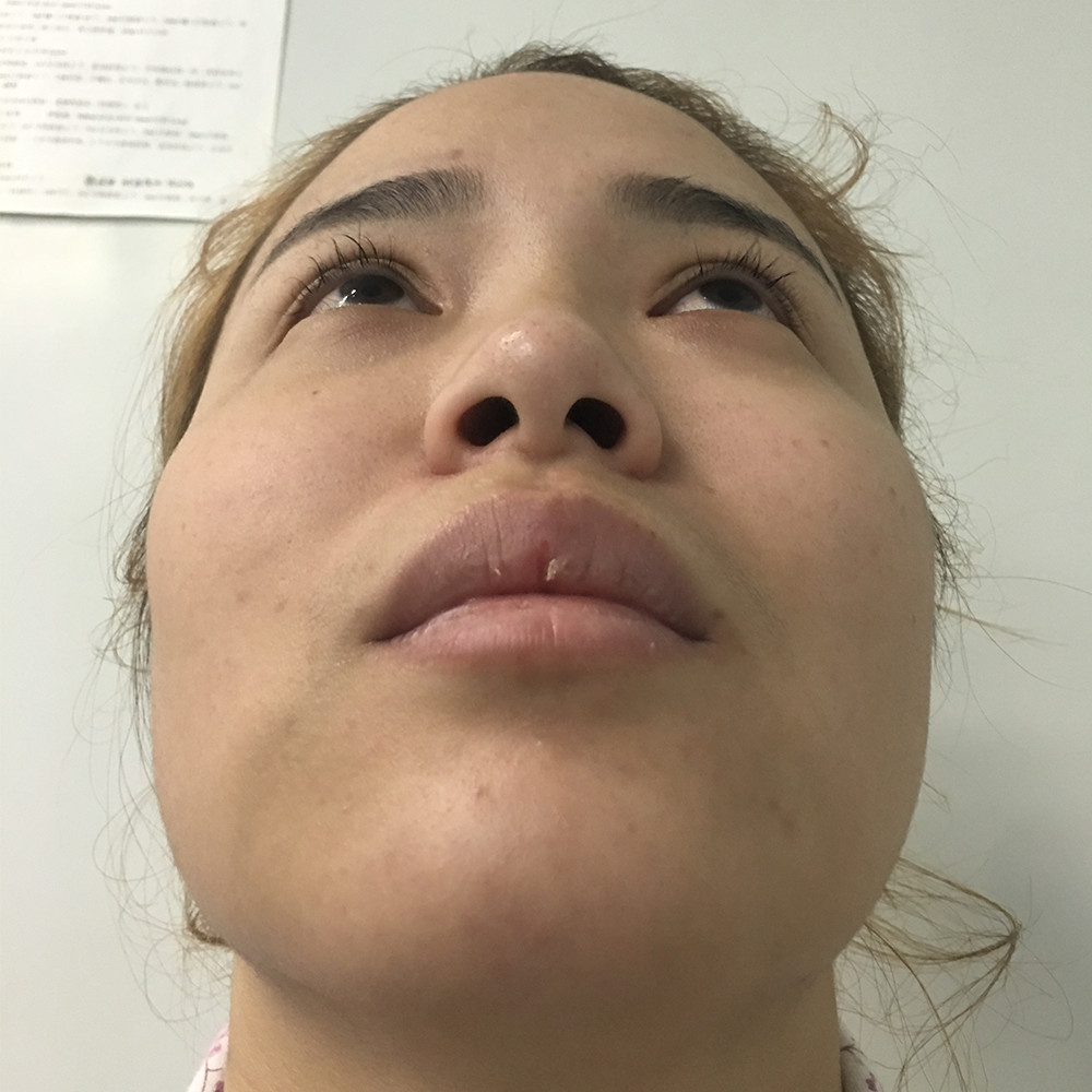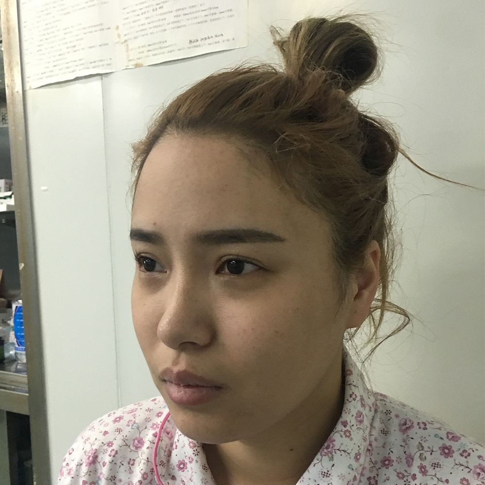 术前鼻梁凹陷,鼻头圆钝,鼻小柱支撑不好,嘴凸,鼻基底凹陷。