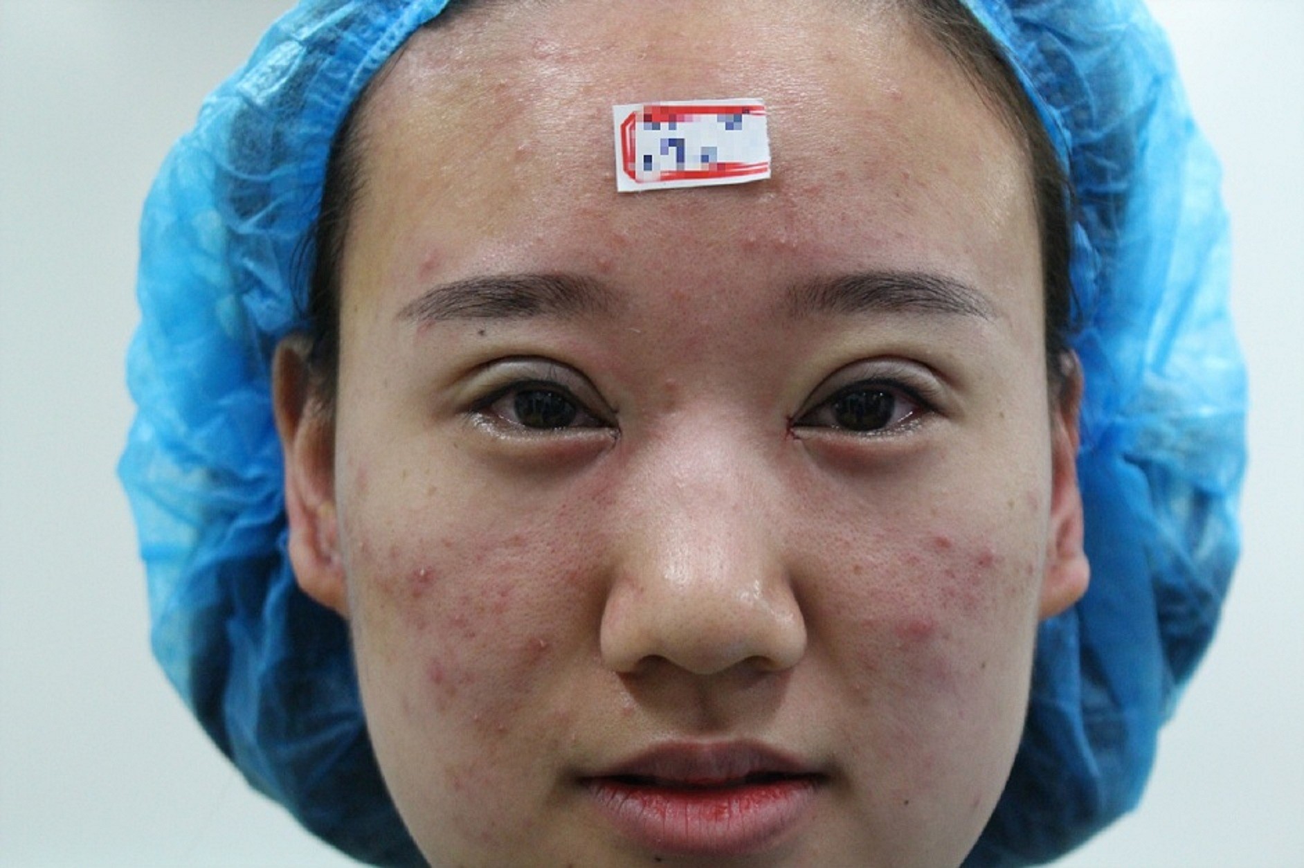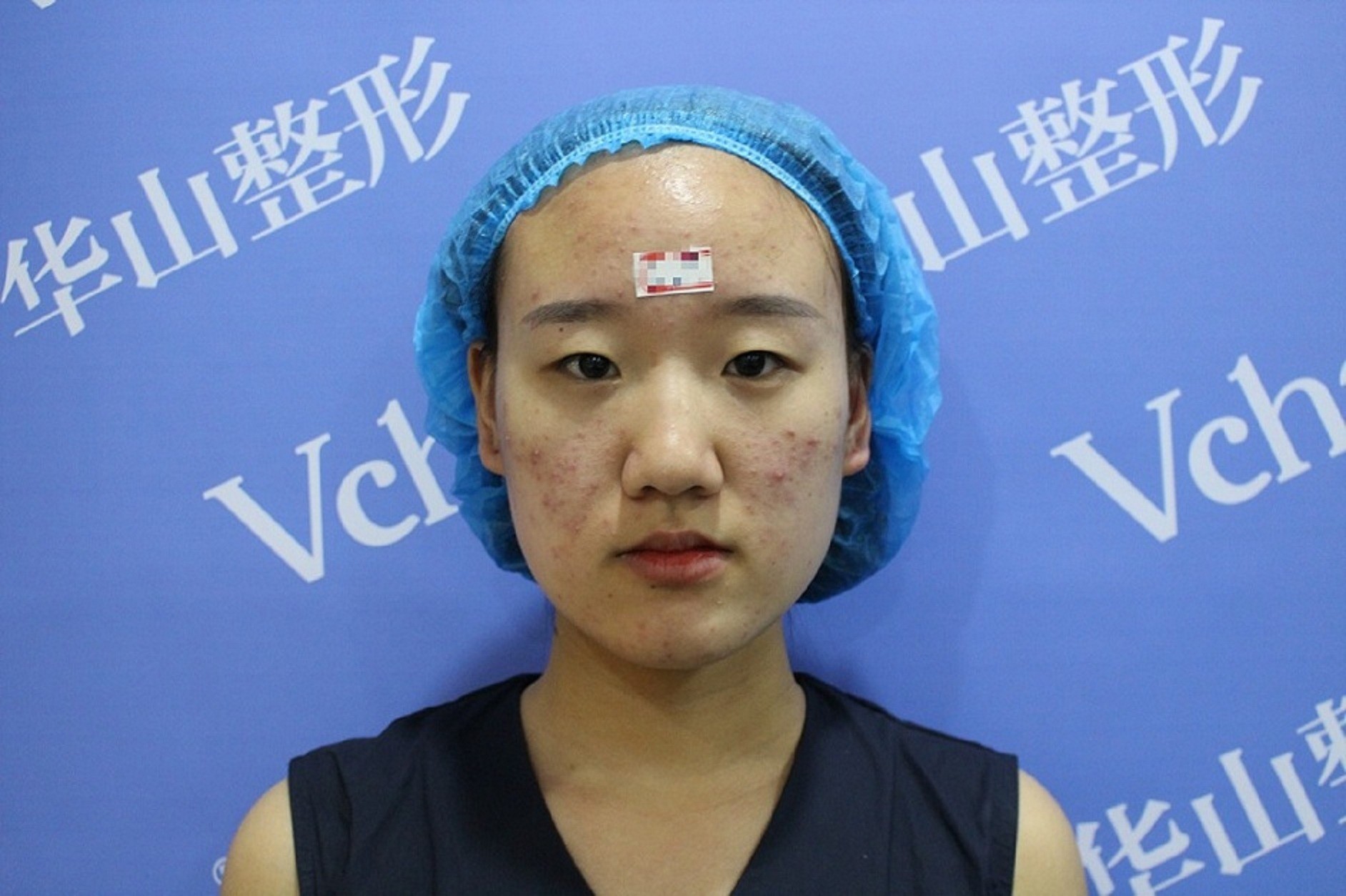从正面看到,梦环的眼睛眼裂较短,两眼间距较宽,不符合三庭五眼的眼部美学标准,给人的感觉没有精神,建议开内眼角,改善眼间距。
