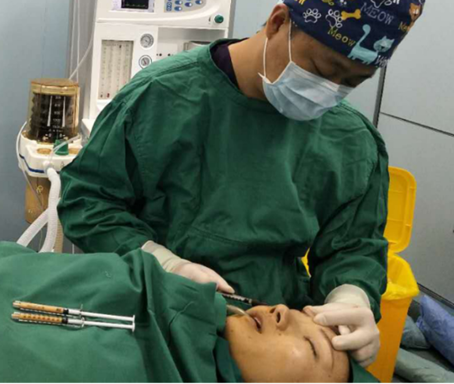 她的情况是需要先注射深层再依次注射骨膜上方肌肉层,筋膜层,这样一层一层的平铺填充,才能让他的脸变得更加紧实。在做眼周时要把眼眶骨要植补出来,是均匀的植补出来,在皮下软组织泪沟的地方,均匀的少量的浅层铺一部分,打的脂肪不能有游离感的视觉效果,才没有硬结感。