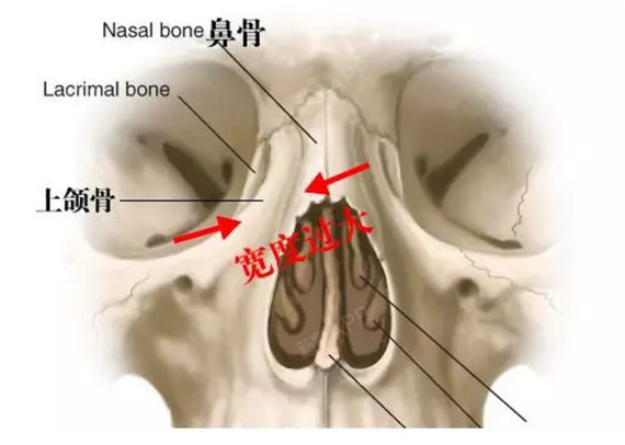 鼻骨过宽主要是上颌骨与鼻骨衔接的宽度、坡度过缓过大造成的。
