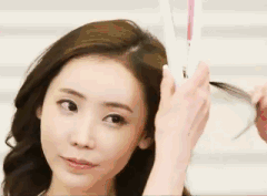 龙须刘海也只需要用到一个卷发棒就好,把额头前分出两缕头发,从根的位置往发尾方向卷,一开始先卷大卷,第二遍拨出一小半再斜向小卷,靠近发际线的一圈头发要着重打造弧度。