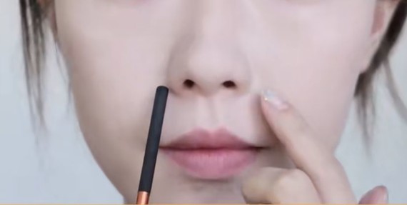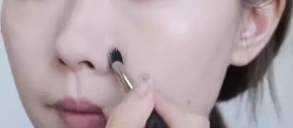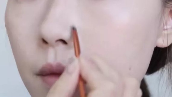 然后用修容笔划一道在理想鼻翼位置,手指晕染开,鼻翼宽问题就解决了。