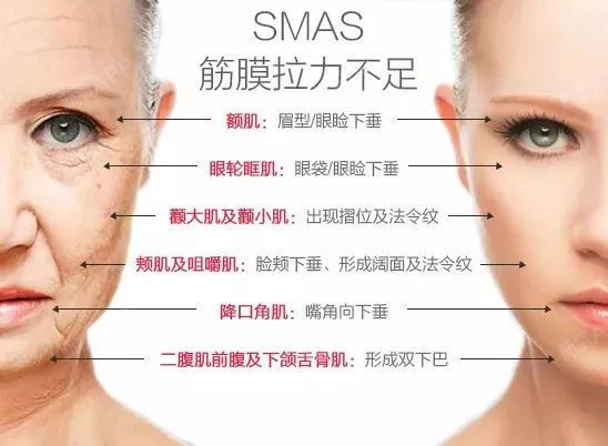 另外在人体的头骨外面有一层筋膜层,医学上称之为SMAS筋膜,蛋白流失、肌肉组织松弛,也会使得支撑面部脂肪层的筋膜失去支撑力,出现脂肪垫分离、下垂、萎缩、变形等问题。