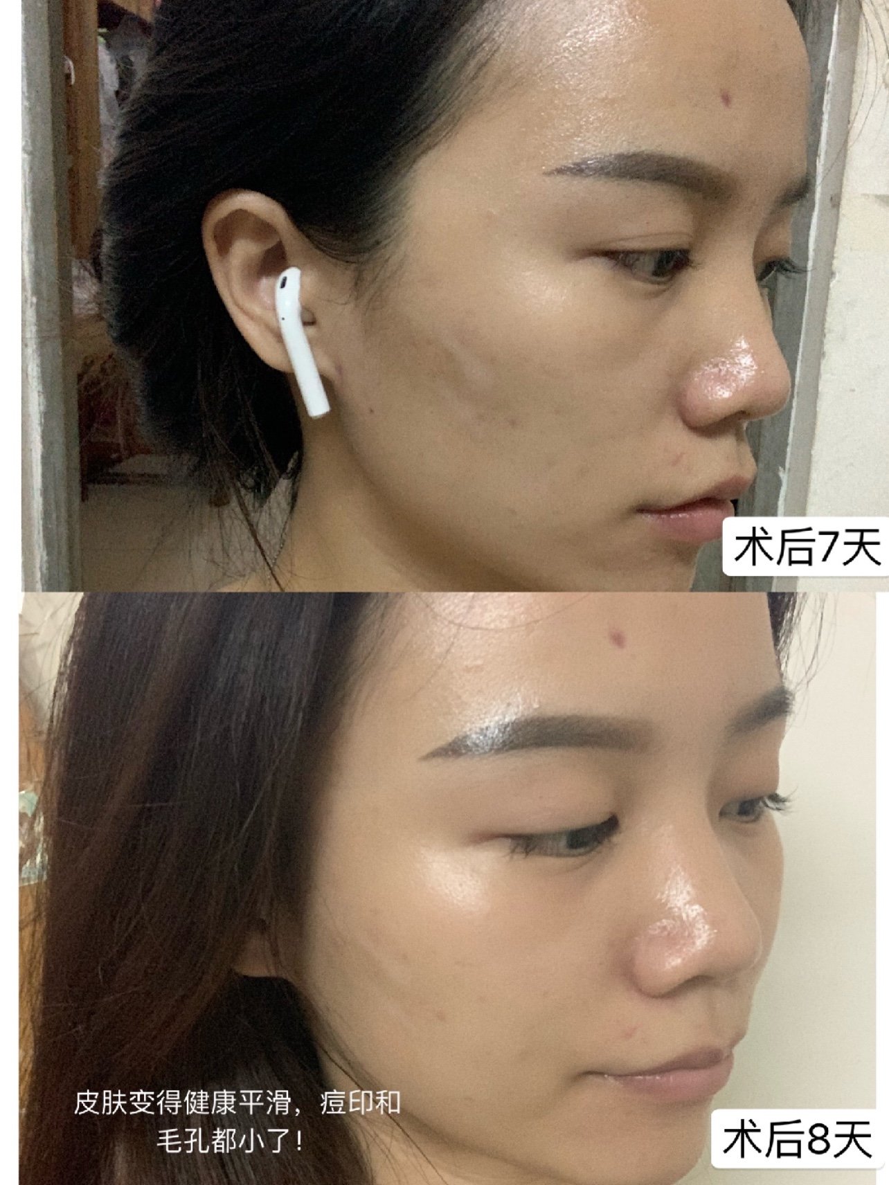 🌟术后7~8天🌟右边脸颊的伽掉完了,感觉效果出来了,整个脸干净了很多,痘印淡了,而且感觉皮肤比较紧致,有弹性,健康的感觉;大家看术后8天的图是我护肤完的图,是不是感觉皮肤在发光🤣毛孔和痘印真真淡了很多!