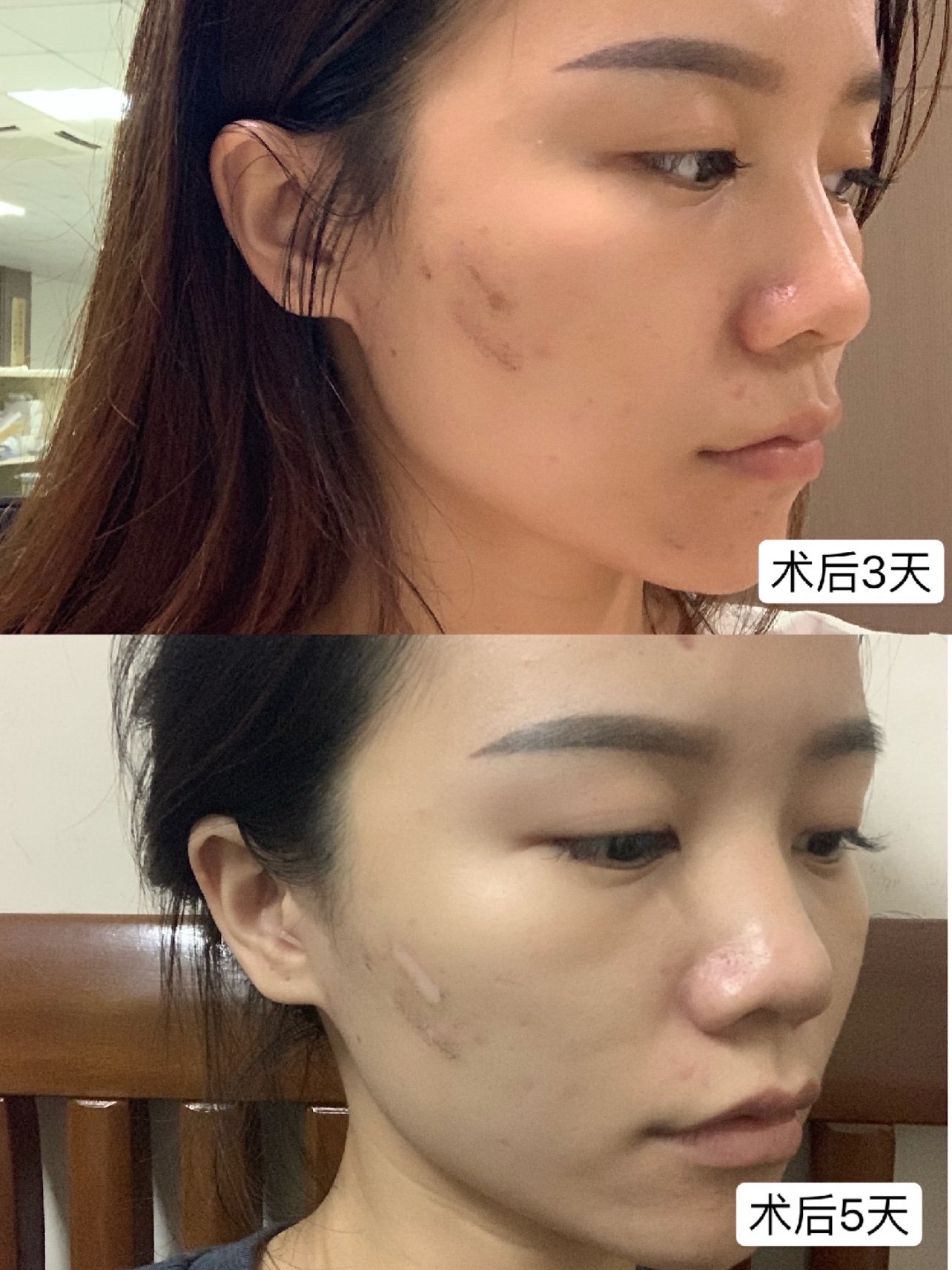 🌟术后3~5天🌟结痂开始掉了,结痂掉完是新长出来的嫩肉,白白的嫩肉,医生说是正常的,要加强补水,过几天皮肤慢慢又会恢复正常颜色,在这期间,皮肤感觉还是有点痒痒的,脸还是黄黄的,所以我每天敷两片面膜补水😏