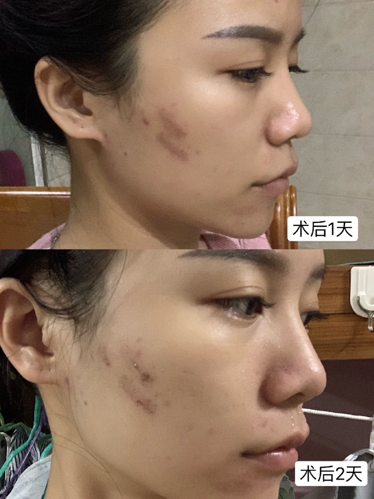 🌟术后1~2天🌟晚上到家了,就发现结痂了,主要都是色沉的地方结痂了,右脸颊,下巴,左脸颊,额头。脸不痛也不红了。但是脸的肤色没有太大改变,我是那种去蒸桑拿脸都不会红的,感觉自己皮很厚哈哈哈哈哈,所以我安慰自己,效果还没出来😢