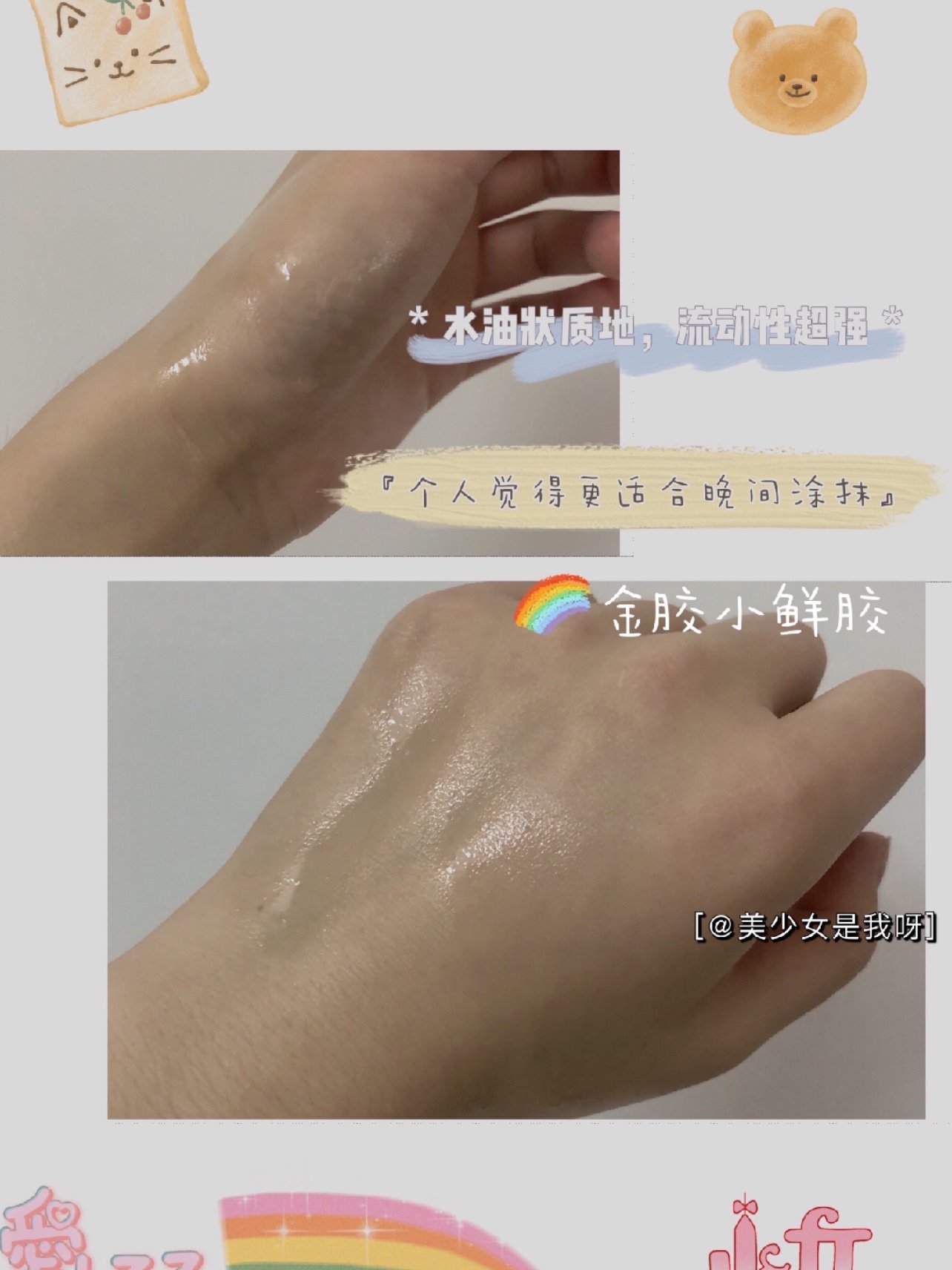 👉🏻使用感:水油感,流动性很好,倒在手背就滑没了🤗,偏油,但没金胶油。