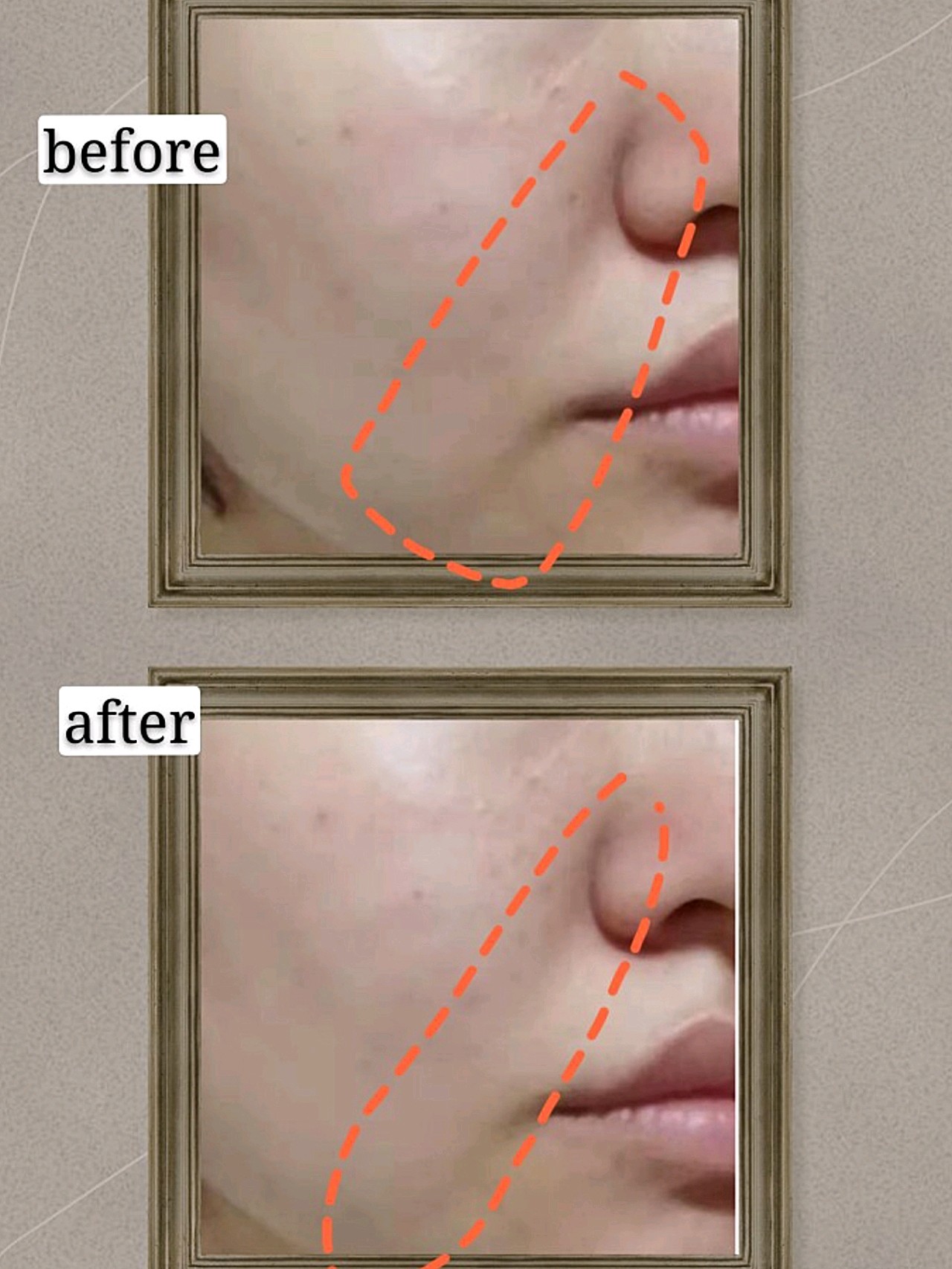 主要是侧面,鼻翼这里的法令纹看上去淡了一些些,还有嘴角这里的木偶纹也有些减轻。