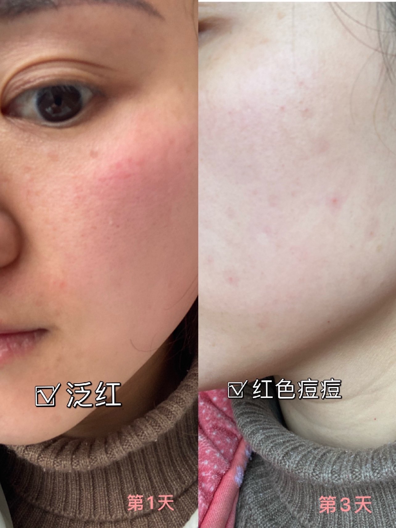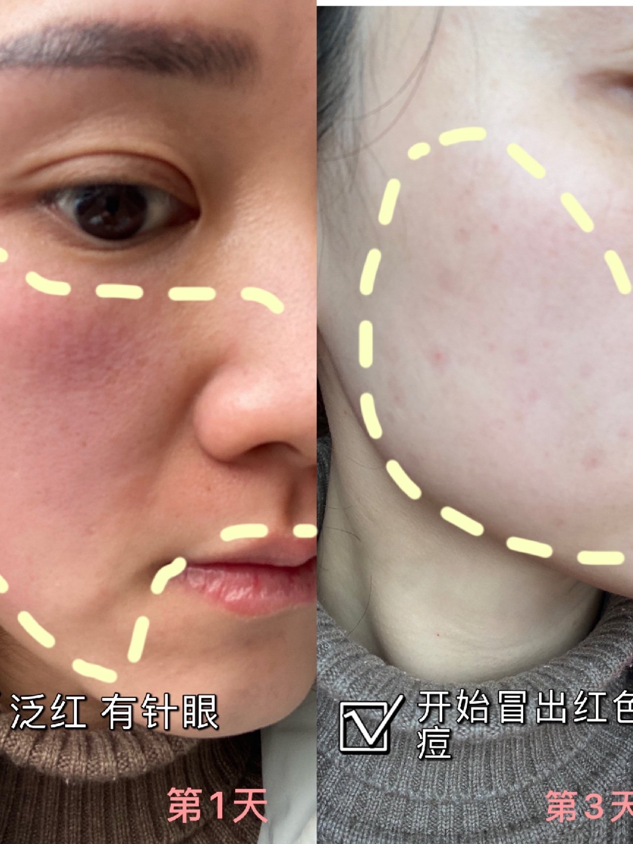 第2天开始 针眼变淡 但却发现两颊 开始长出了红色的小痘痘?! 🤣就像是平时上火后偶尔长 1.2颗那种痘痘, 而且鼻子下方也干得起了皮屑,上次做完可丽金 什么不好的现象都没有😳 可这次又长痘又起皮屑的,赶紧去问了群里的姐妹和医院的助理,告知说我这是正常现象 多补水 ,敷面膜修护,后面就会好起来,我这才放心啦 比心❤❤