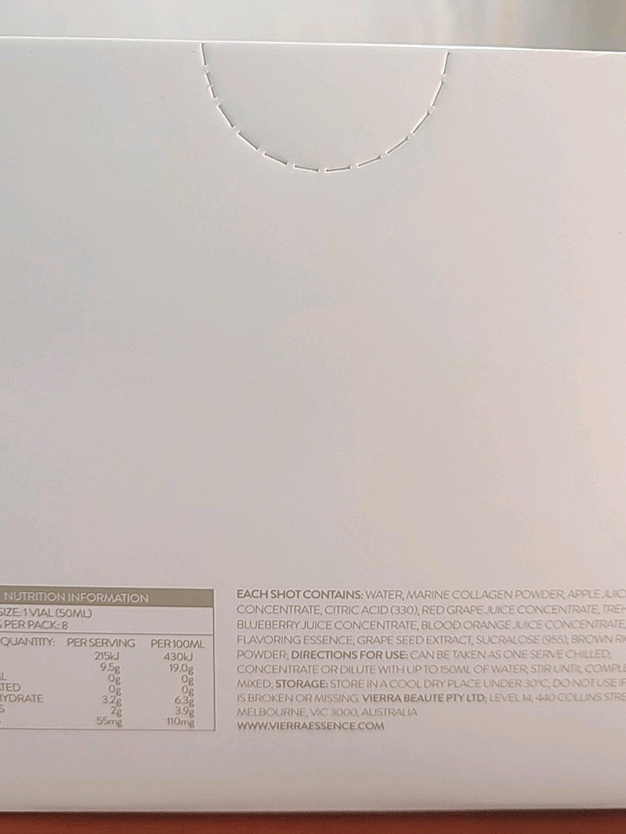 包装简洁好看,一盒里有八小瓶,口服液液体更好吸收,但同时也对成分、口感等生产要求更高,VIERRA能完美达到这个条件。