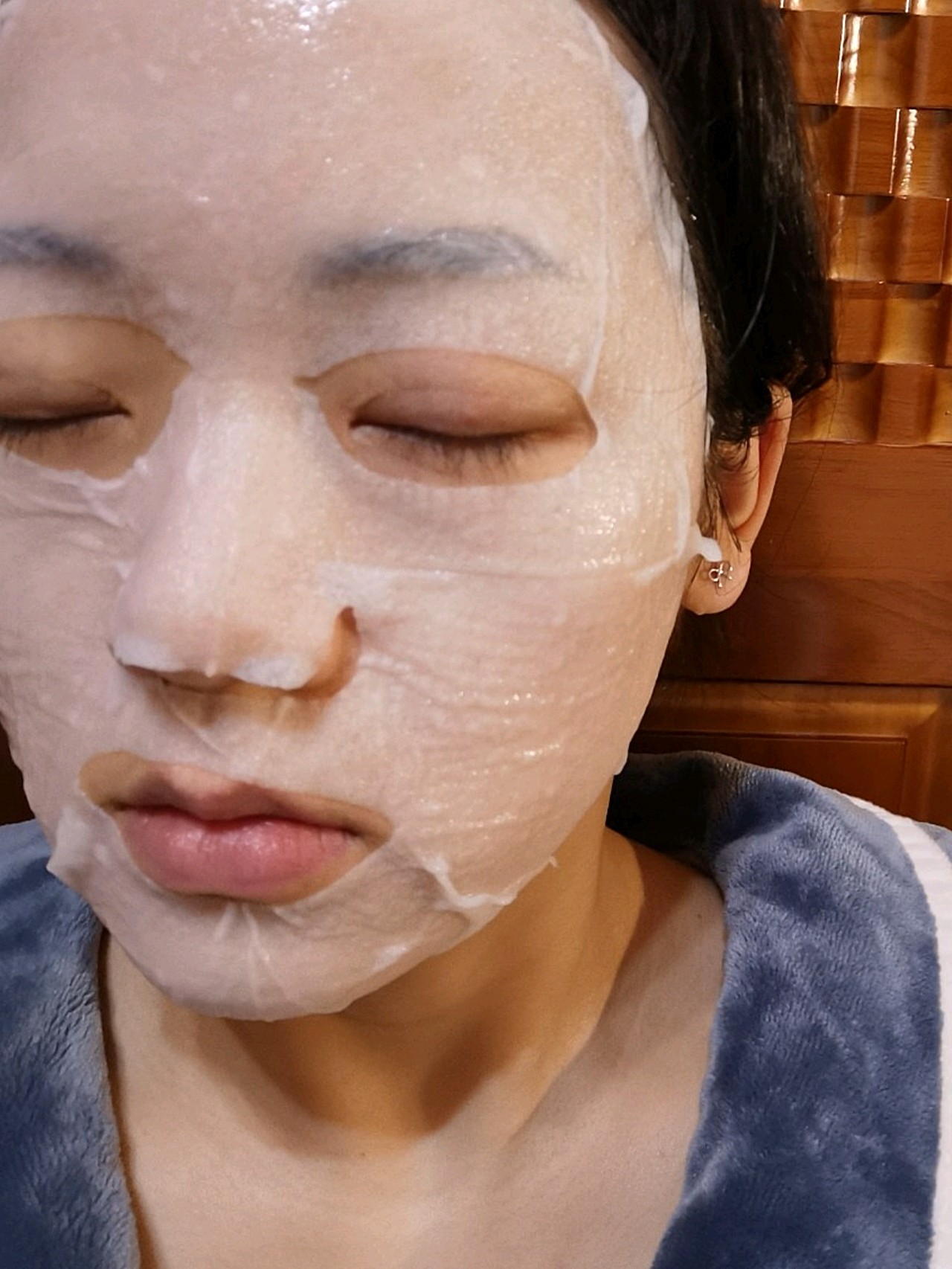 个人感受:成分还是很不错的,之前用过绽妍的妆字号面膜,使用感受很好,作为同一公司生产的面膜,个人期待非常大,但是具体效果如何还是要上脸试试。打开看看精华液非常多,面膜拿出来之后,袋子里剩余的精华液倒带手上也不是像以前用的一些面膜黏糊油腻的感觉,挺清爽,再往脸上敷的时候还是很好吸收的,面膜敷在脸上很清凉,有镇静的效果。敷了差不多十分钟左右的时候,我感觉面膜的精华被吸收了一些,但是脸没有被紧绷的感觉,之后做别的事忘记时间,过了半小时才想起来把面膜拿下来,不过还好没有变干,拿下来的时候脸上还是比较湿润的,用手拍了拍脸, 不黏腻,摸起来滑滑的! 把残留的精华洗掉后正常护肤,第二天起来摸着脸比之前滑了不少,效果还是很显著的,更适合刚做完医美的皮肤。