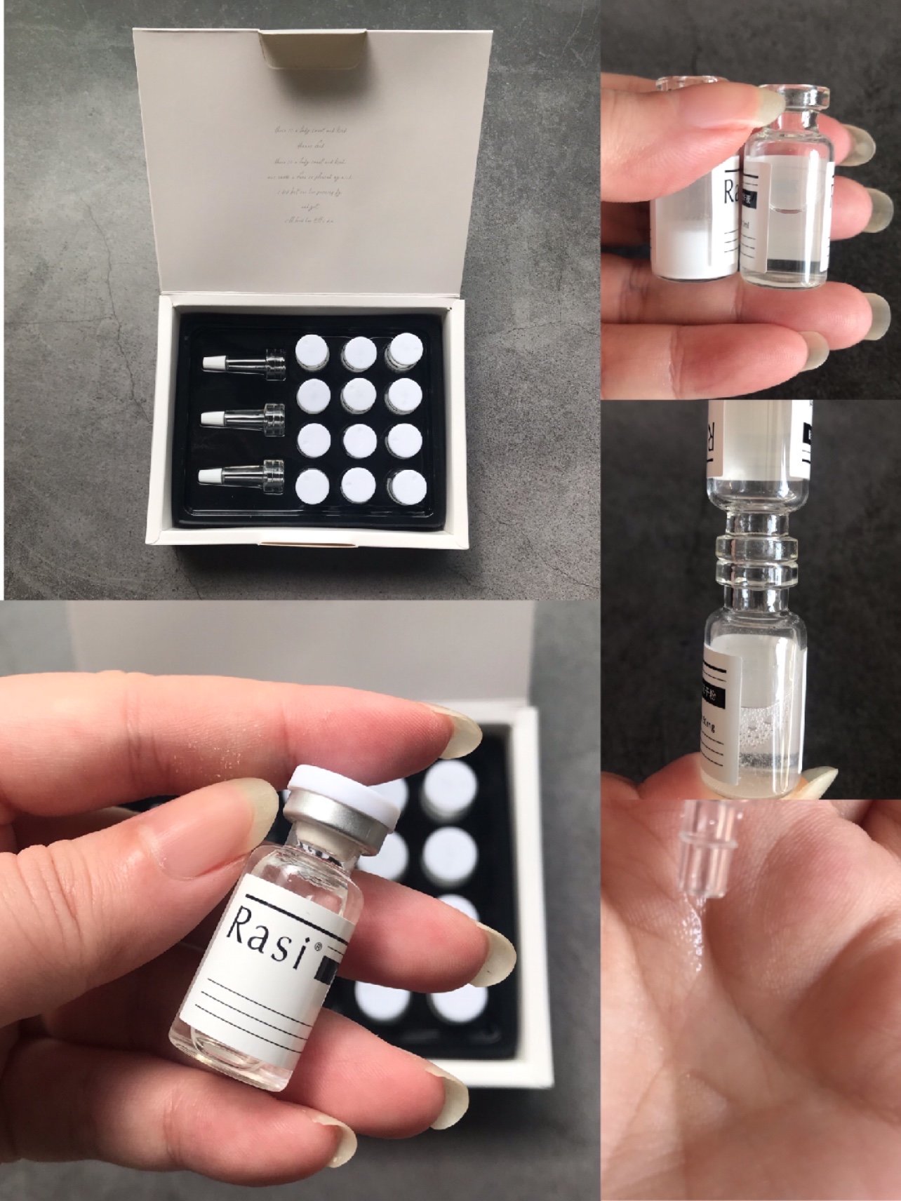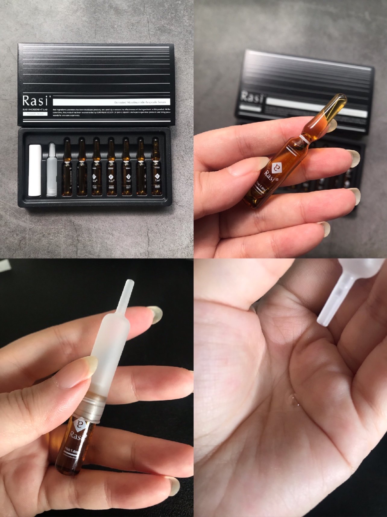 👉烟酰胺安瓶,一共7支,是透明液体,盒子里面附赠了开瓶器和滴管口。使用起来非常方便。把开瓶器套在安瓶上,用力往下一按就可以轻松打开安瓶。之后套上管口就可以使用了。