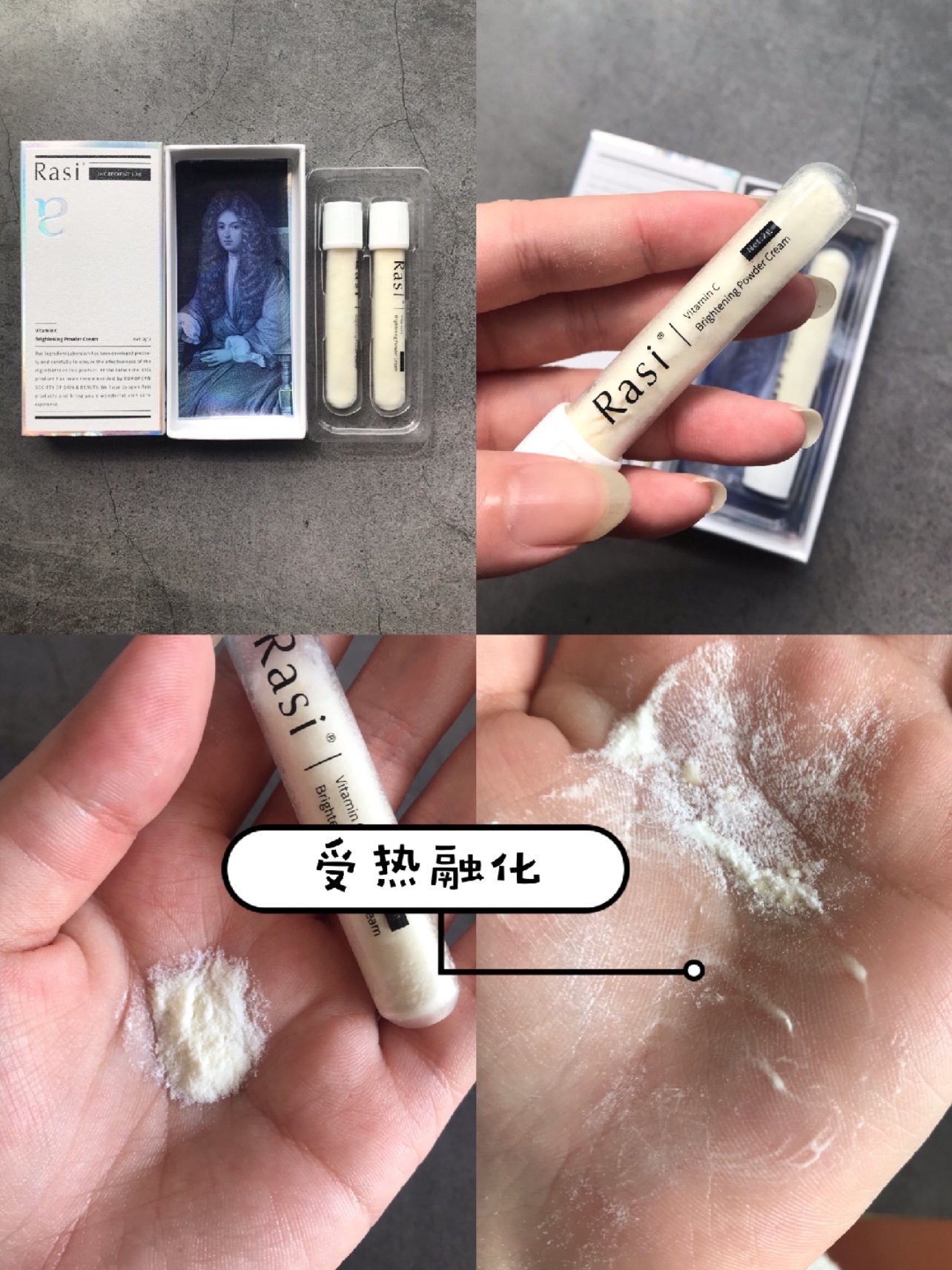 👉VC粉化霜,2管,他是白色的粉状物,但是轻轻用手一摸就会变成类似膏体或者水的东西,轻松在脸上吸收。我一般是现在手上起2泵乳液之后,轻轻的倒上vc粉化霜。混合均匀后涂抹脸上。