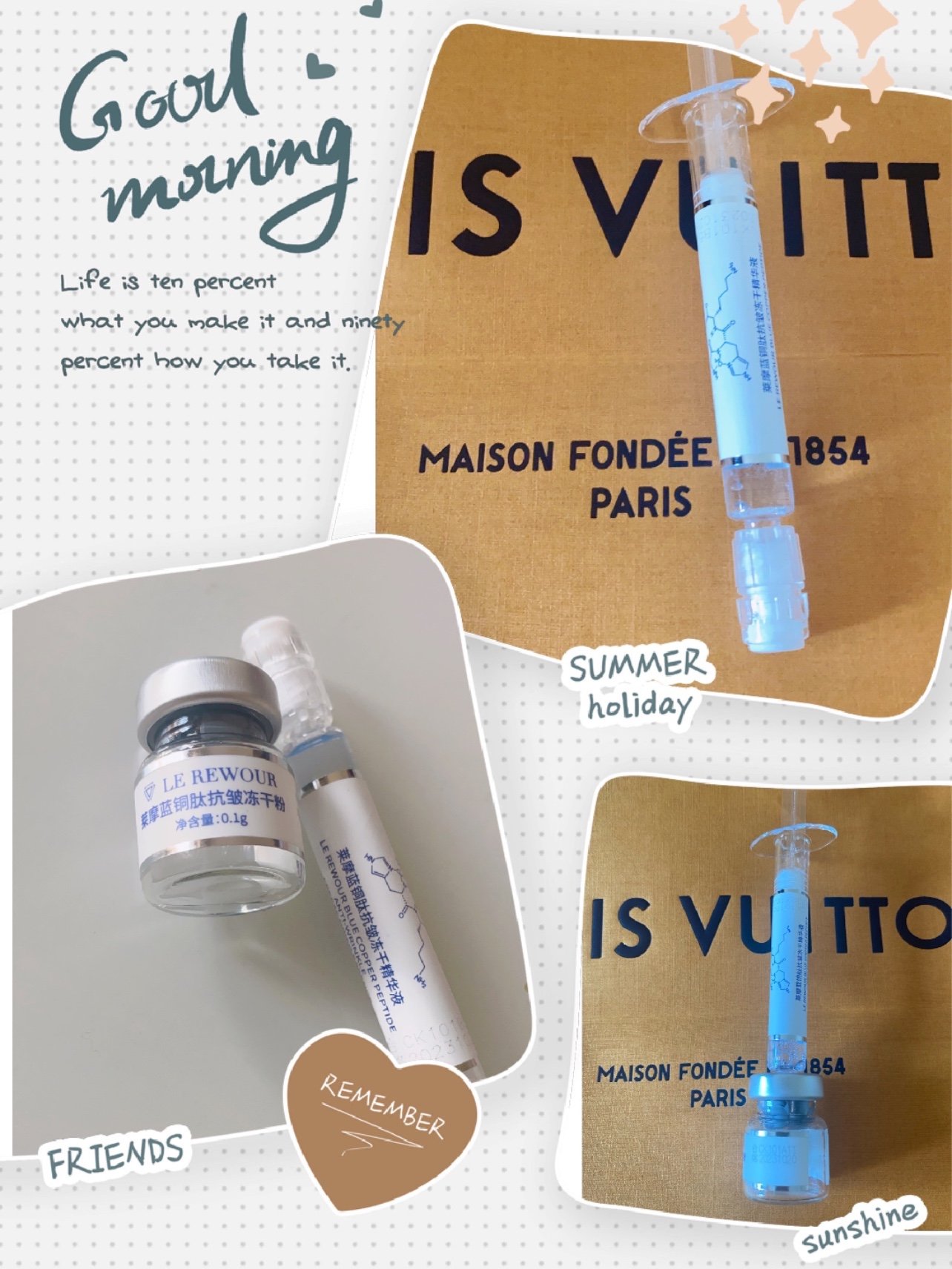 这款莱摩蓝铜肽产品是西林瓶➕针管搭配使用,我的用法是每天早晚各一次,清洁面部之后,先打开冻干粉的小瓶子,小针管直接插入冻干粉胶赛切口处,把针管内的精华液注入冻干粉瓶中,注入之后必须轻轻摇晃,才会完全溶解,变成淡蓝色液体,插入针管抽出混合后的全部精华,拔出针管,推出适量精华于面部,轻拍至吸收🧽就可以了🐟
