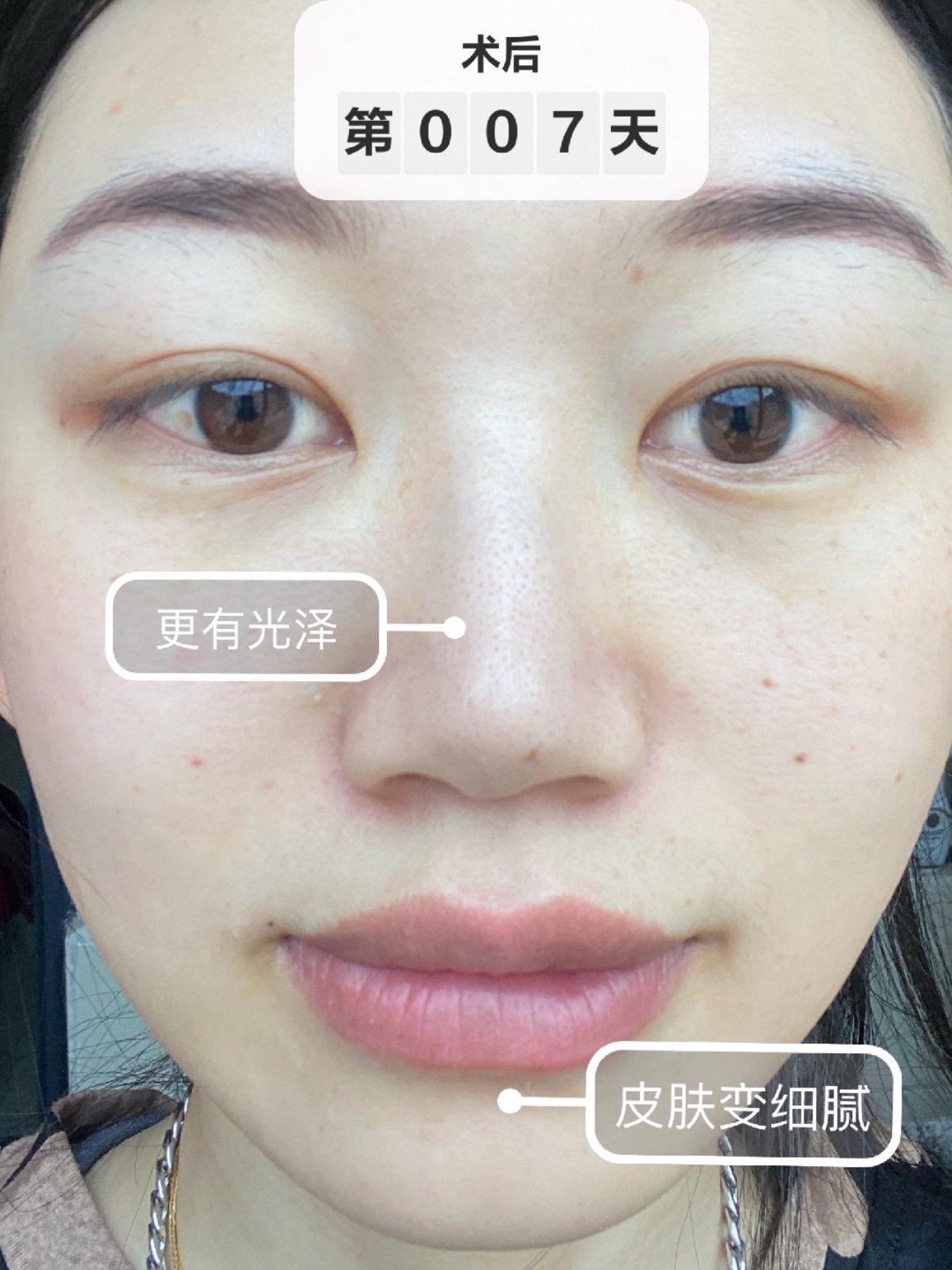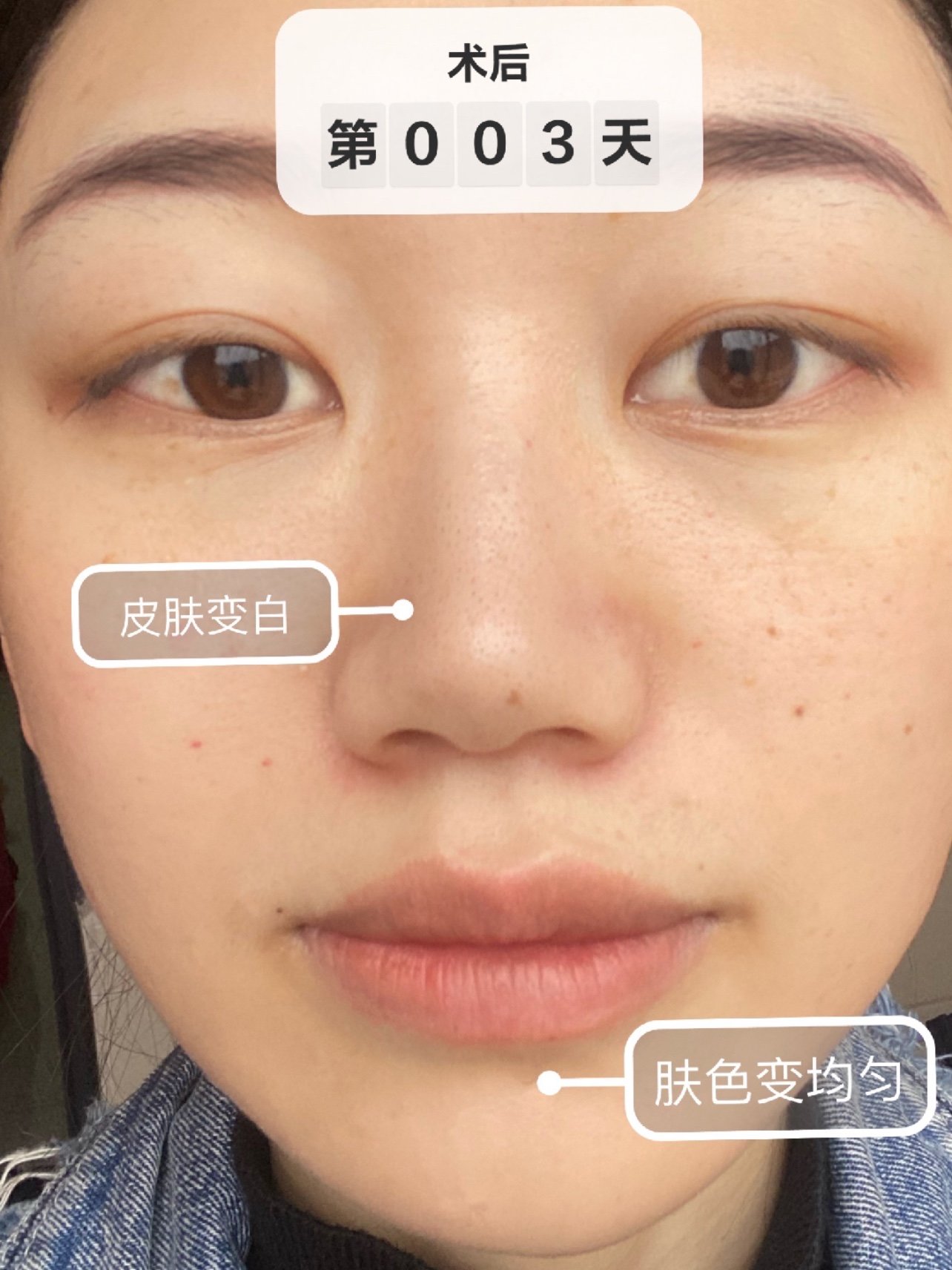 👏🏻打完大概三四天的时候,针眼就消失了,皮肤看得见的均匀很多,暗沉的部位明显变白变亮了,斑点看起来都淡了很多,比较明显的是鼻侧和嘴周(看图四:原相机无美颜无滤镜,室内拍摄)