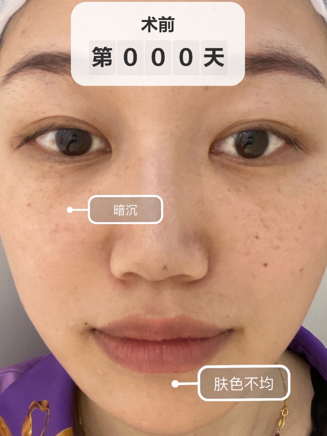 🙈我本身的皮肤肤色不均匀,尤其是眼下、鼻侧和嘴周泛黄、暗沉,然后我两颊有大大小小的斑点(看图三:原相机无美颜无滤镜,室内拍摄)
