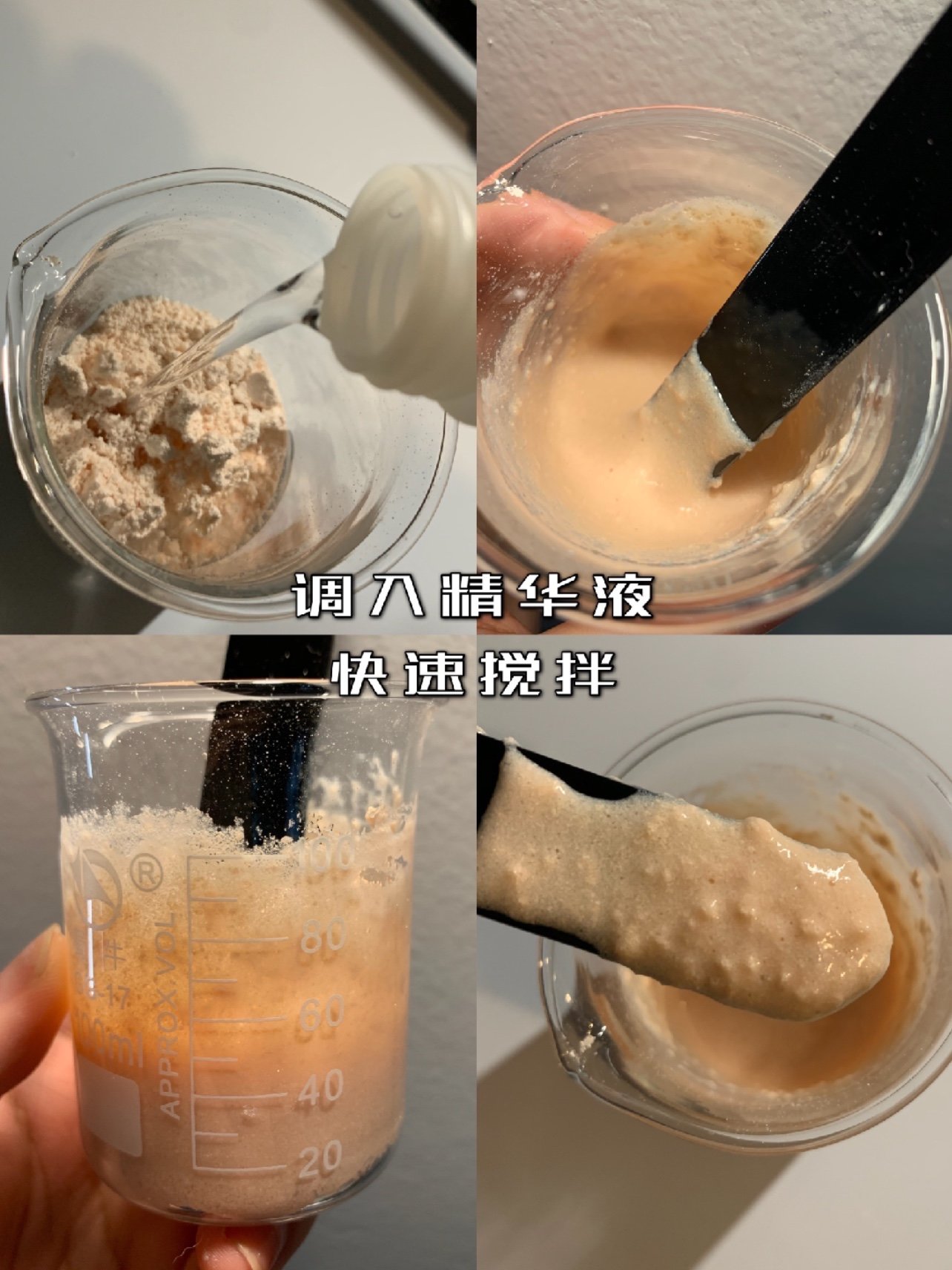 ✨面膜粉和精华液混合后有淡淡的香味,用自带的面膜棒涂抹会比较好一些,需要手速稍微快一点,要不然会变成豆腐渣样子更难涂开~