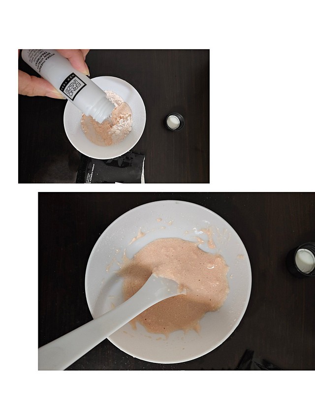 除了加强皮肤补水之外,也是敷奥伦纳素冰白面膜来给我的皮肤急救一下,冰白面膜是有特定的面膜粉和面膜调和液,它的面膜粉是肉粉色的,倒入液体迅速搅拌均匀,就可以敷上脸了。