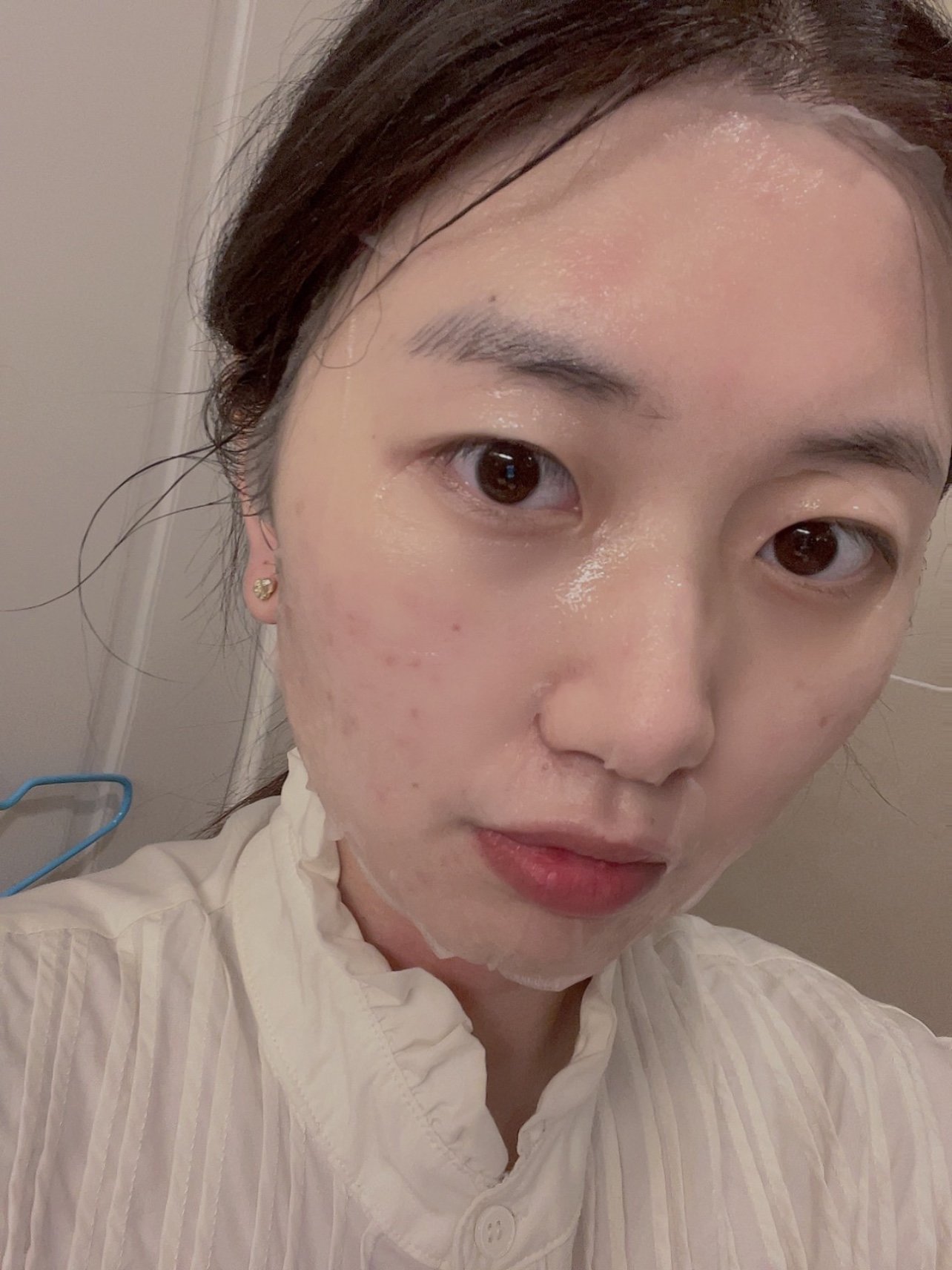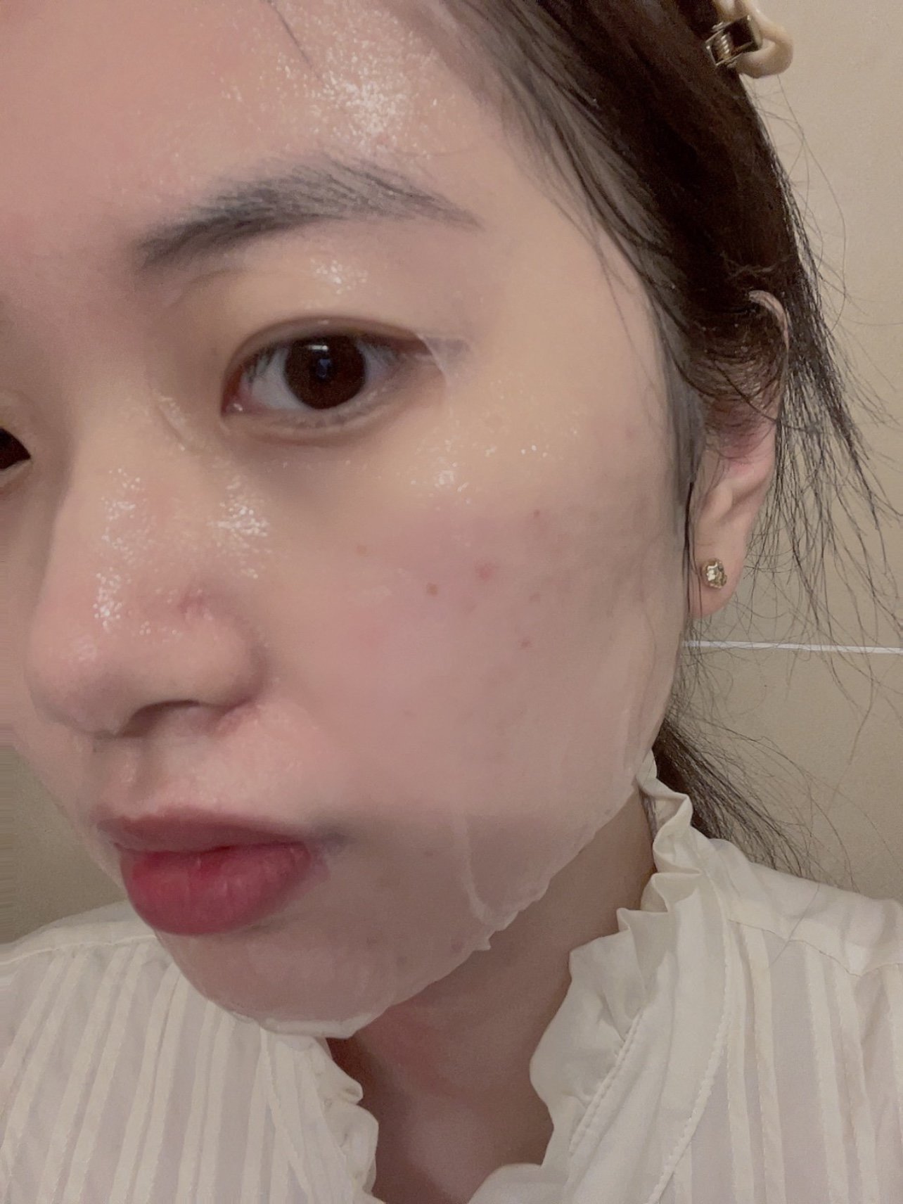 🤩绽妍辅料一盒6片装,晚上立马就拆开敷啦!面膜纸上脸很舒服,很服帖!敷上后不像其他面膜一样往下滑,绽妍采用医用级复配透明质酸,敷上后没有闻到什么味道相当于无色无味吧!保湿补水能力不错~(看照片就能看出来啦)