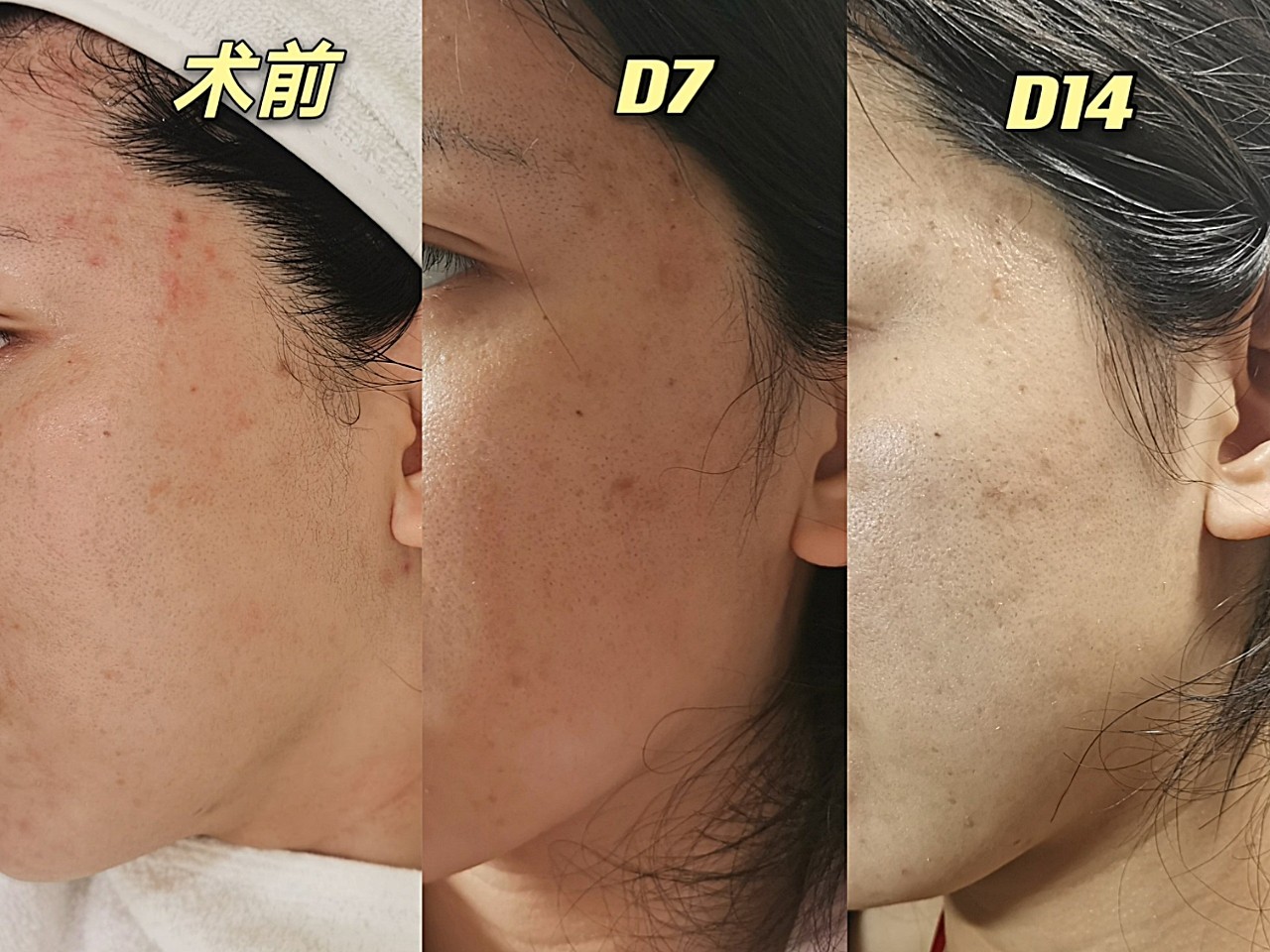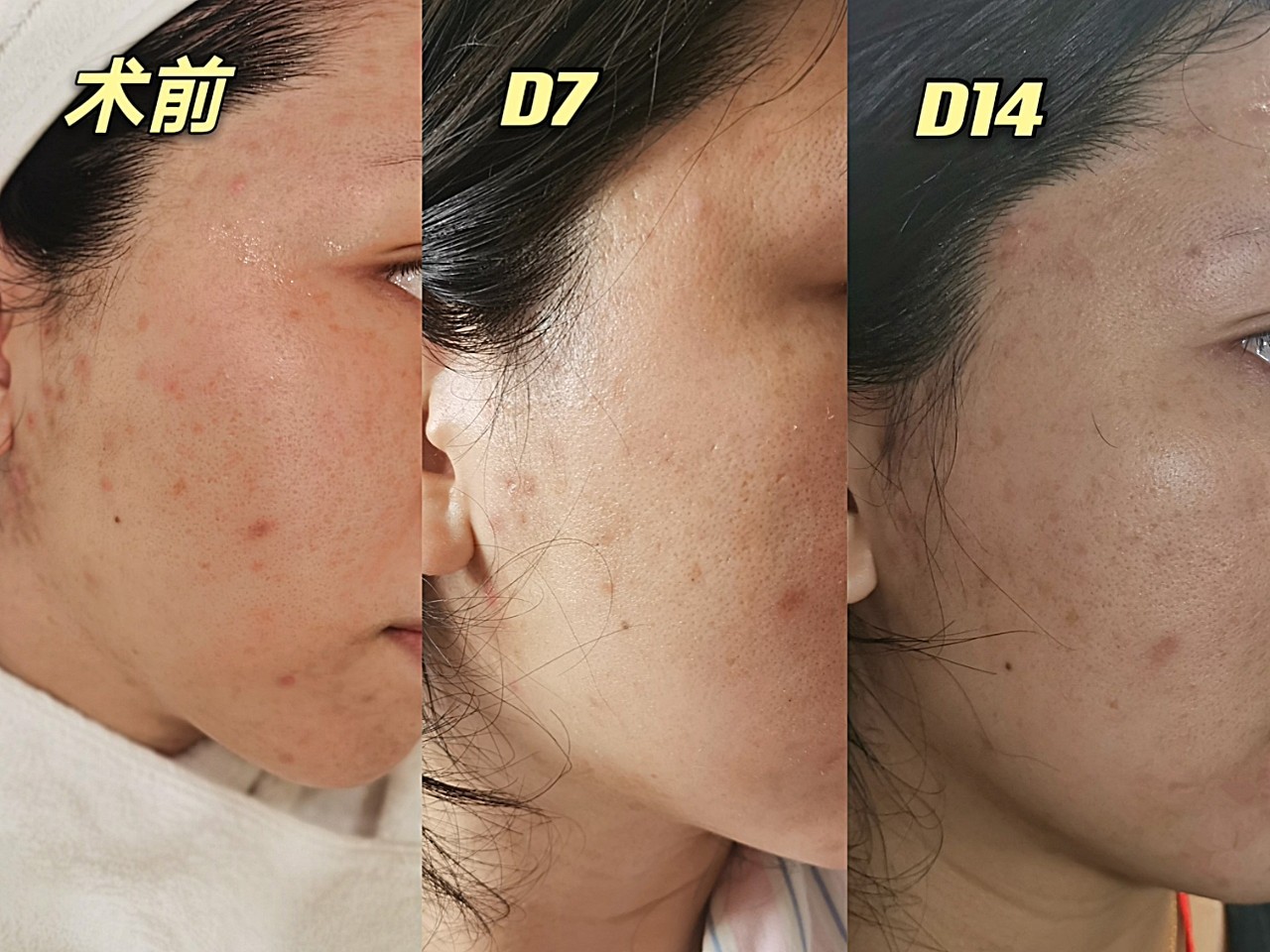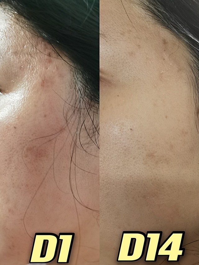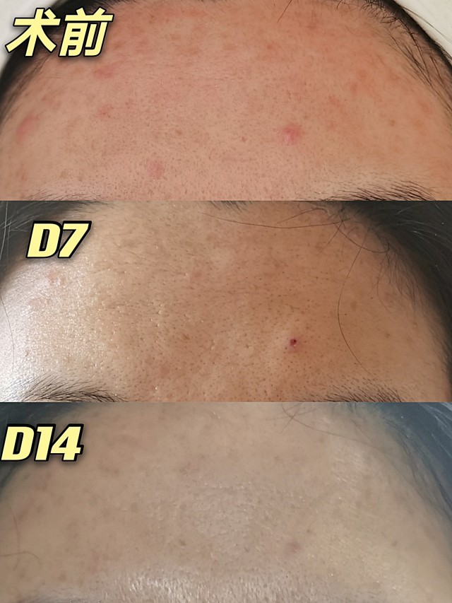 第8天至14天,这段时间😘😘😘肌肤的细腻度和白皙程度有所提升,毛孔有所缩小,痘印有所淡化,下巴处的闭口出了白头。🌚但痘痘变化不是特别明显,面部基本不再有大颗的炎性痘痘,还存在一些小的闭口,如果想进一步消灭闭口,一周后可以进行下一次治疗💉。