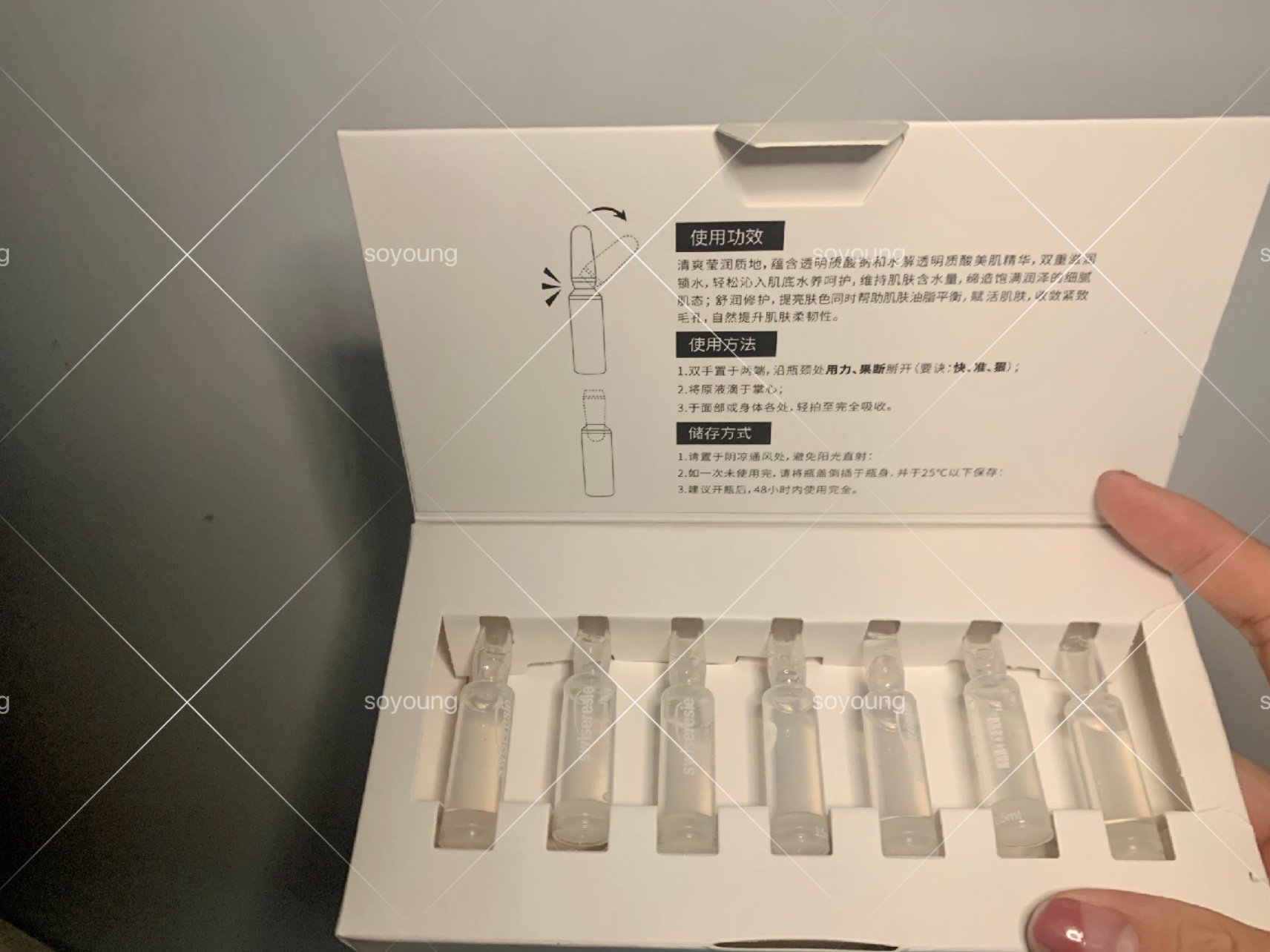 项目体验过程:一盒里面有7支,恰好是一周的用量,都是独立单只包装,一次用一次,很卫生,也很好控制用量,还能抹脖子,改善颈纹。