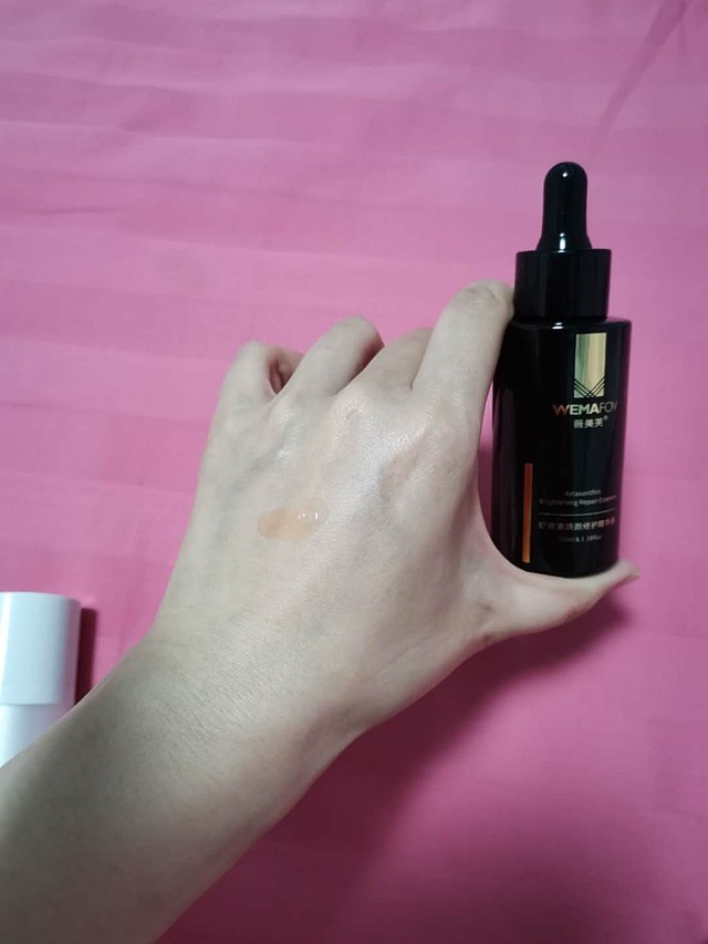 🍊产品介绍:精华液稍浓稠,是虾青素特有的颜色,应该叫棕红色吧,没什么味道。整体水润也很容易吸收,上脸后略微粘稠,吸收后就不粘啦。
