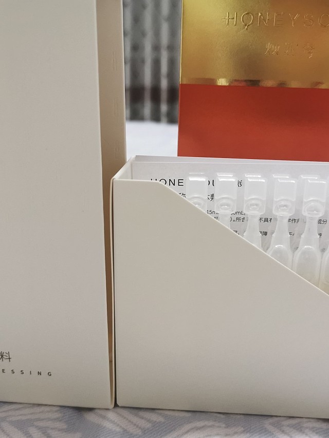 焕妮秀这个牌子一开始还没听到,但是拿到包裹后拆开真的被惊艳到了,包装特别有质感,精华液的拿取方式的小盒子也很有意思,是可抽取式的包装。两排各15支,整整齐齐的排好,特别让人有想拆开使用的欲望。