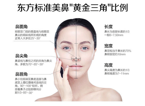 然而由于种族基因,东方人大部分以低鼻梁、宽鼻翼为主,符合亚洲人审美的鼻子,眉骨最高点、山根最低点和鼻背的要成一个折角,这个折角大概120°为最好。
