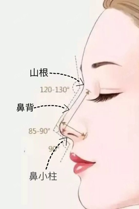 鼻尖与鼻小柱的夹角约为90°,鼻小柱与上唇的夹角为90°最为合适,还有就是山根的宽度不超过眼间距的二分之一, 鼻翼的宽度要大致与眼间距平行为最佳。