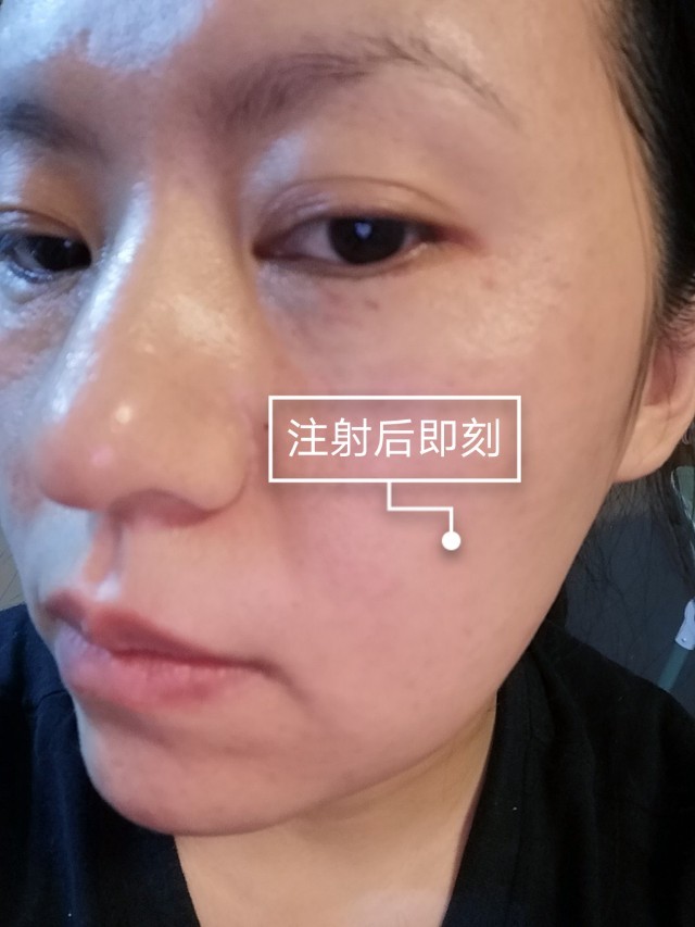 这次注射的氐珠三文鱼水光针总共两支,每支2ml,一支手打眼周,一支机打两颊和额头。注射完即刻说实话有些吓人,右眼淤青一块,机打的针眼也挺明显。