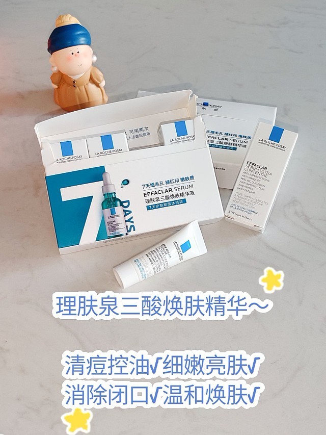 😻产品特点:这款理肤泉三酸焕肤精华液之所以叫三酸精华,是因为它蕴含了三种酸,分别是4.5%的果酸,具有焕肤效果;1.5%的水杨酸,可以改善闭口、0.45%的辛酰水杨酸,可以调理清痘,复合式的酸功效更全面,而且除此之外还含有2.0%的烟酰胺,可以美白提亮肌肤,真是是非常全面的功效啦~😽