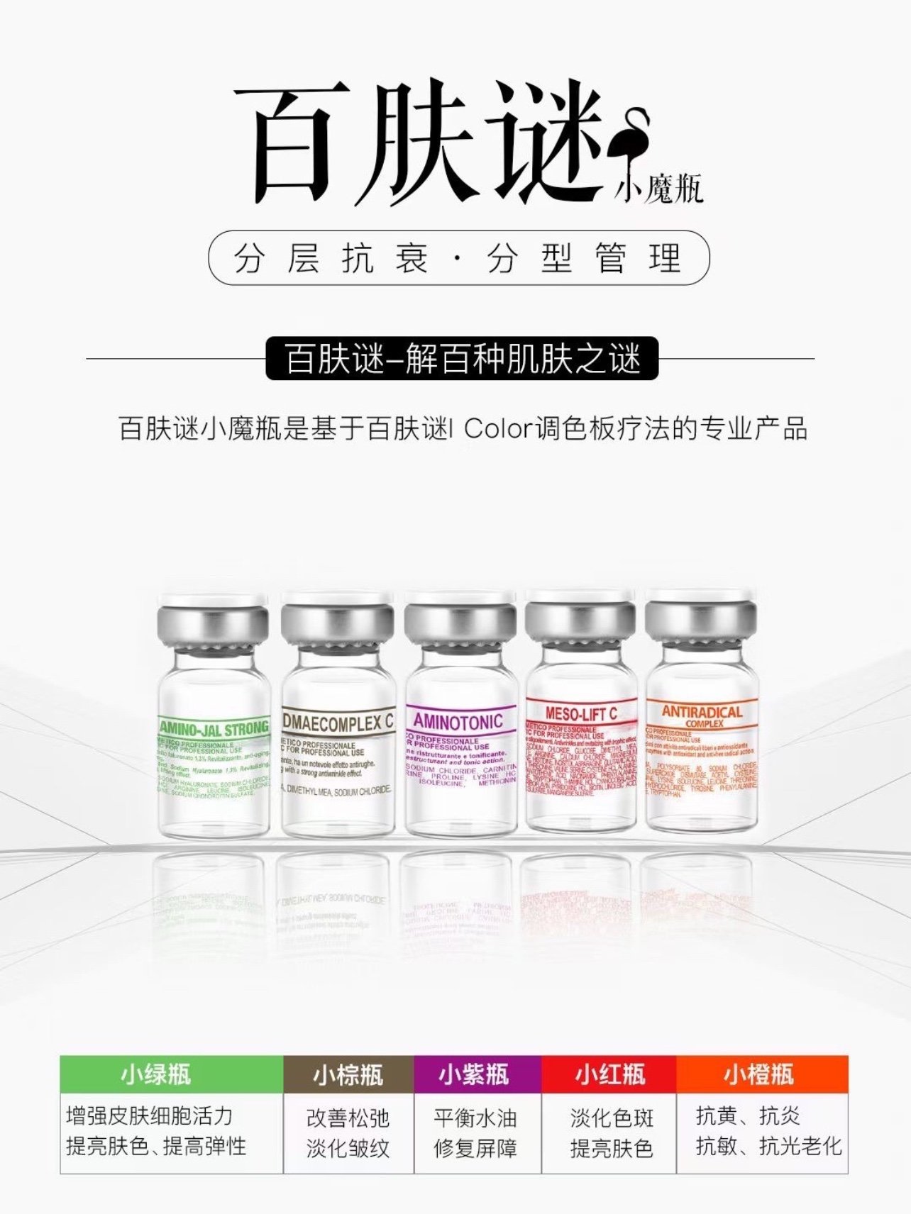百肤谜有5款小瓶子,根据不同人的皮肤类型,干性,中性,油性以及出现的已经衰老和未衰老的问题,会进行一个针对性解决。5款小瓶子相当于5种颜料🎨,医师会根据我们个人皮肤特点以及特质来搭配专门定制专属皮肤方案。