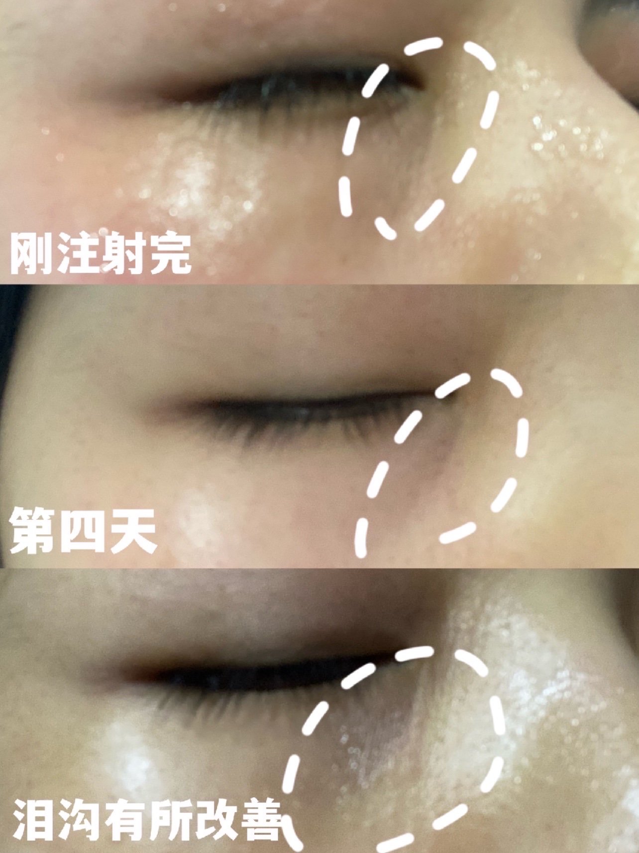 体验后效果:自己肉眼可见的看见泪沟不明显了~黑眼圈还是有的!但是这不重要了!泪沟哭了真的减淡了~爱上爱上了😢😢😢😢希望新氧爸爸多多看看我😘😘😘😘新鲜人 记住啊!眼睛周围水润了很多!真的是肉眼可见啊!朋友们冲啊!真的绝绝子~