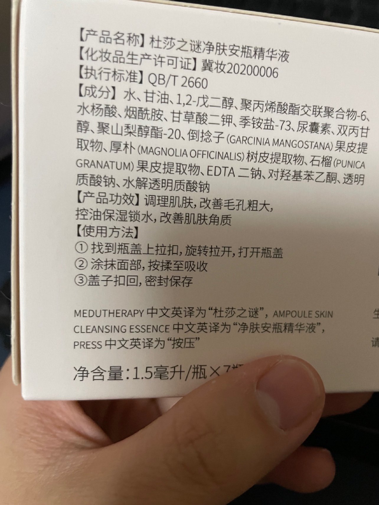 这款精华很好吸收,涂在脸上丝毫没有粘腻感,不会影响后续的护肤,而且这款精华在祛痘的同时还做到了温和,不会给皮肤造成刺激,对敏感肌姐妹很友好哦~另外,它还含有甘草酸二钾、皮傲宁以及三皮素等成分,既能给皮肤补水保湿,还能祛痘控油呢,一盒有7小只,早晚都可以用,为避免活性成分流失,建议开瓶后24小时内用完,如果痘痘不多的,可以在痘痘重点部位点涂,适当增加用量,如果是改善肤质的,可以在毛孔粗大,粉刺闭口多的地方均匀涂抹,长期坚持使用,可以逐步改善痘肌。#杜莎之谜净肤安瓶精华液