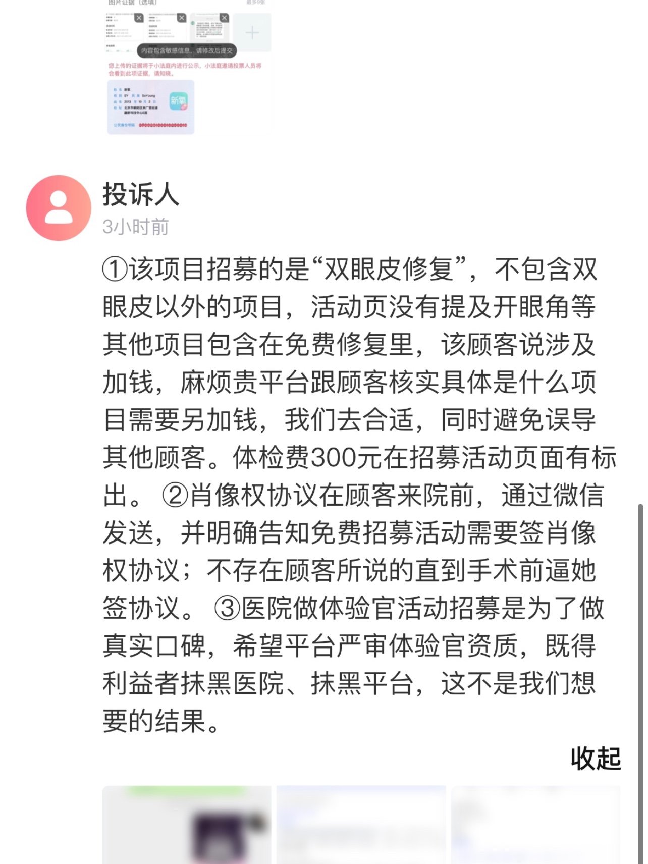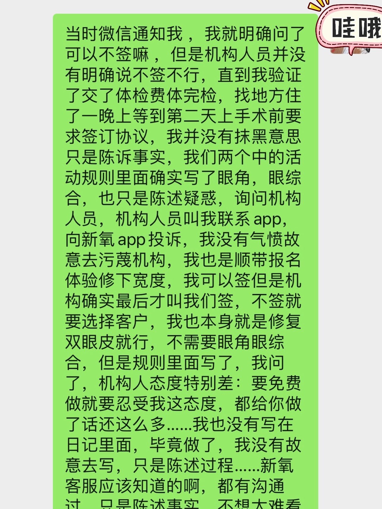 个人感受:我没有污蔑机构的意思,也没有夸大,气愤去说什么,我眼睛也只是想调宽一点,确实也免费给我做了,现在效果没出来,对于我日记写的哪一点,是我闭着眼瞎说的,上面规则写了,机构有自己想法,顾客有疑问就不行,我只是把过程写了,这么大医院就投诉我日记,不能让人说?我有那一句说你们医院坏话了?你们接受不了事实过程,那可见你们也知道那样做不好,我在医院,咨询师说我朋友眼睛需要加眼角提肌,我就说她的体验上面不是写了有眼角吗,提肌她不做,我有非要你们免费做提肌?只是规则上写了有眼角就表达一下疑问,如果做体验之前医院确实只想做眼皮这一块的,做活动前那一环节出现失误造成误会,好好解释都是可以理解,不做就不做无所谓的,但是医院态度特别……我上篇日记有说什么嘛,难道机构营运自己当初那样态度,你说本公主听着那,爱做不做,不做走好……叫我闭着眼舔着脸 写,医院棒棒哒,咨询师小姐姐棒棒哒,高冷的好帅?满意至极?没有污蔑没有污蔑没有污蔑