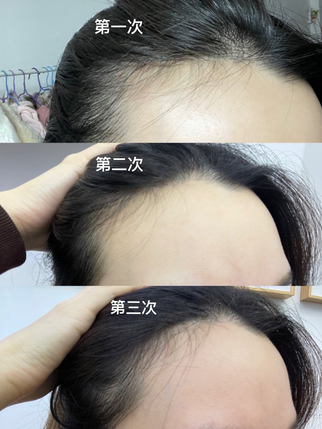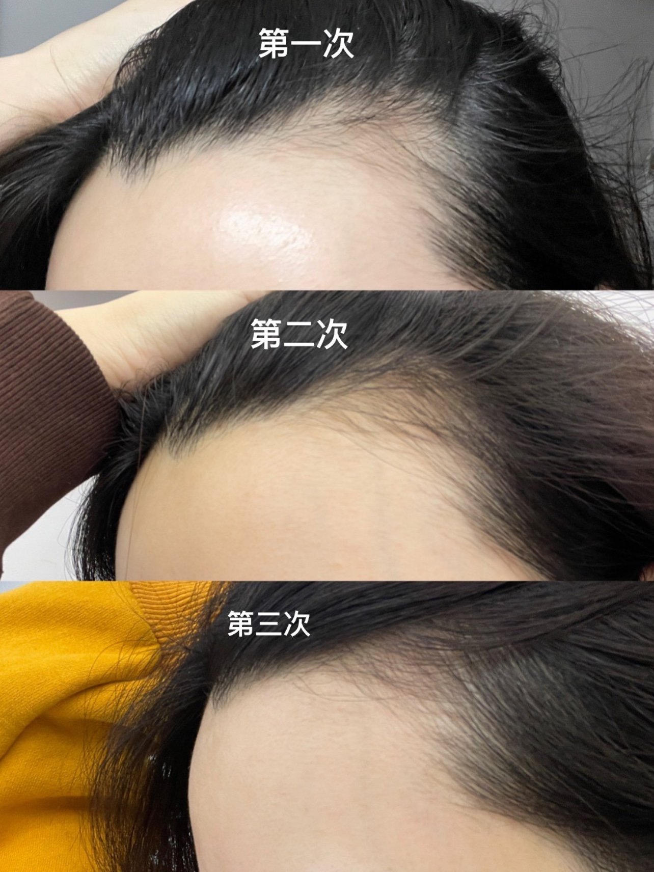体验后效果:效果我找了这三次的图片对比,其实肉眼能看出,我的额角绒毛长得更长更粗壮了,发缝也有变窄一点点。