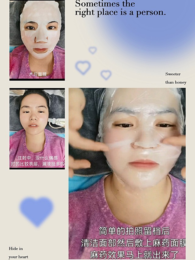术前简单的拍照,然后就用了麻药面膜,麻药效果不错,很快起效,整个过程痛感可以接受,少量出血,属于正常现象。注射完以后,敷了配套的面膜,面部没有不适感。