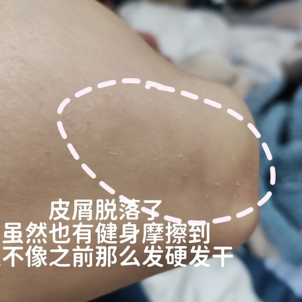今天早起看了下肘部,真的是有变化,原本发干的皮屑脱落了很多,受损的部位也变软了。健完身洗完澡又涂了一下肘,现在(傍晚)看颜色都没有那么暗沉了,那些皮屑从换瑜伽垫之后就一直不停的存在,虽然没有再磨破,但每天的平板支撑还是会摩擦到,又干又硬那层皮屑也剥不下来,我都怕它们堆积到最后成了茧子😩,昨晚的无意之举倒是帮我解决了这个问题,修复的能力是真的强。