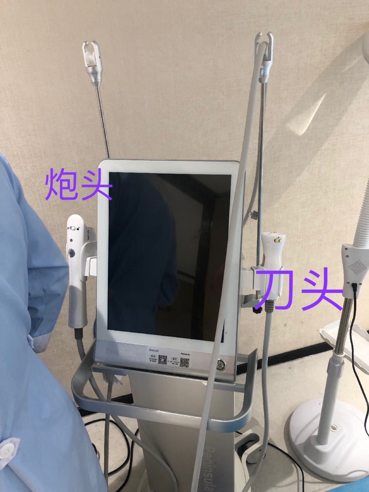 好,接下来介绍一下治疗情况。半岛超声炮治疗前不需要敷麻药,清洁完脸部后医生会涂上凝胶。待机器启动,就开始操作啦。可以看到机器左边的是叫刀头,右边的叫炮头,听起来感觉能量很重强度很大对不对?但实际上操作起来感觉还挺好的。医生开头先用刀头操作,调一个适中的能量,我觉得没什么感觉,然后他就把能量调高一点。刀头主要是,每按一下就会有连续像电流一样滋滋滋的感觉。他帮我把一侧脸的中下面部多操作一遍。然后沿着下颌线,还有下巴也加强。因为这是有设定时间的,机器会提示治疗结束。接下来就用炮头在脸上不断打圈滑动。可以听到,机子是一直发出滴滴滴的连贯的声音,然后脸上也会有点刺刺的感觉,但总体也不痛。医生就一直在脸上,滑动大圈。完成炮头治疗后,会再用刀头,再做一次巩固。