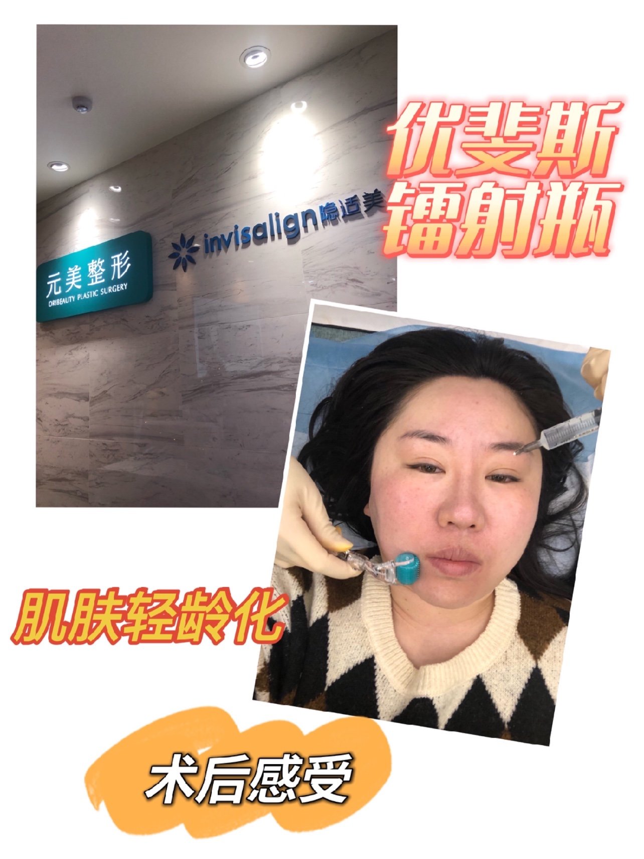 美白、淡斑、改善暗沉、初老为一体的优斐斯镭射瓶体验来啦!除了感谢新氧和优斐斯,再次感谢新氧安排了元美整形这家机构,非常的专业、干净,服务又特别好的医美机构,先说一下这是去了那么多机构,第一次约好的时间能按时安排好项目的医美机构,而且全程服务跟进也特别的好,卸妆洁面后先做皮肤检测,会如实告知个人肌肤现在存在的问题和护肤建议,护士小姐姐也超级温柔,给涂抹好表皮麻药后也主动告知所需要敷多久的时长,看我在玩手机还帮我主动调节好床位角度让我躺的更舒服,敷好麻药后就开始做镭射瓶的微针啦~而且做的过程中也是会一直询问皮肤有没有痛感,而且微针滚的超级到位,脸上除了眼周,其他位置都有滚到,操作的时候也是个小姐姐给操作的,因为闭着眼睛也没看清是哪位医师,走之前也忘了问,做完微针后很惊喜元美整形还给我提供了医用冷敷贴,比起有些借机卖高价医用面膜的机构真的是大方的不止一点半点,而且医师发现我属于敏感肌,在贴面膜的时候还帮我照了灯更好的修复和镇定,全程真的是感受太棒太无敌了,再说说镭射瓶,虽然只有5ml但是量也超级足,滚针的同时就感觉擦在脸上也是超级富足,尤其我这种大脸都够涂好几次,而且优斐斯专注十年以上轻医美产品,镭射瓶内含传明酸、熊果苷、复合氨基酸、乙酰壳糖胺,对痘印、晒斑肌肤,肤色不均,黄褐斑及初老,衰老复杂色素问题非常有效,对于女人爱美白追求简直是完美产品,尤其是适合我这种秉信一白遮三丑的35 老阿姨😀,适合长期使用,目前术后3天了,除了刚做完感觉脸火辣辣的,第二天皮肤就恢复的很好,皮肤有代谢下来的角质,洗脸洗掉了,连续两天贴了医用面膜,今天第三天皮肤状态感觉和平常差不多,保险起见没有化妆,只用了修复敷料和术后修复可用的隔离,有觉得肤色暗沉要比没做前亮,术后第二天元美的医生有回访,还给说了具体事项和产品显化时间,期待十天后皮肤状态分享给大家!!