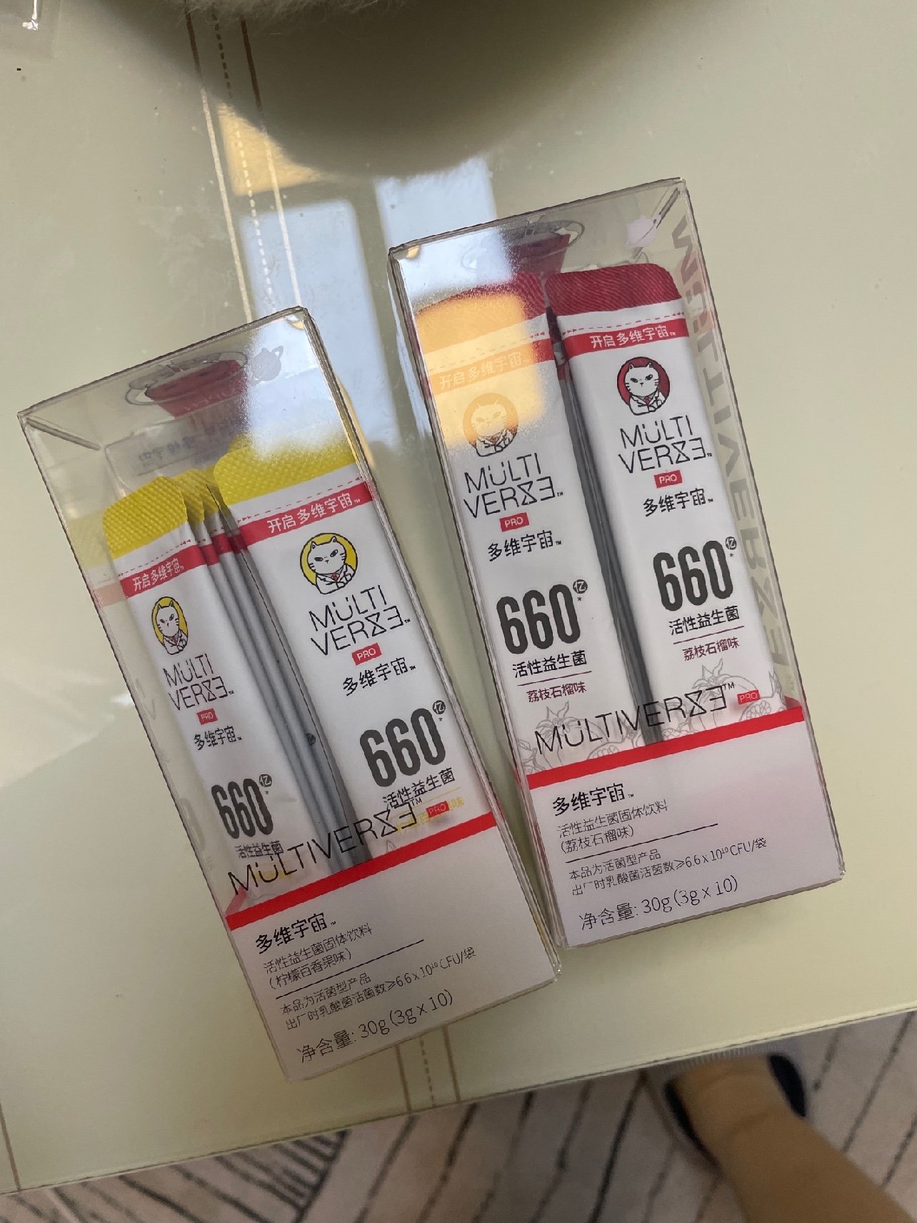 首先包装从内到外就很精致,超高颜值外塑料大包装盒里,另有单独两个小包装,每个包装有10小盒,包装很干净卫生,取用也非常方便,口味分别是柠檬百香果和荔枝石榴味,配料表也很简单,安全放心,看了下说明写的是早晚各一杯,均衡调理,早上柠檬,晚上荔枝,餐后半小时服用哦,我是试了好几次,每次水量都不一样,后面听说可以直接口服,又试了几天,果然效果一样,简直不要太方便,入口有一股酸酸甜甜的口味,感觉平时当成零食吃也可以哈哈哈哈哈,连续吃了几天后,确实感觉通便不少,身心畅轻,而且明显感觉皮肤状态也好了很多,免疫力也提高了,已推荐给身边朋友,会继续回购。#多维宇宙益生菌粉免费试用