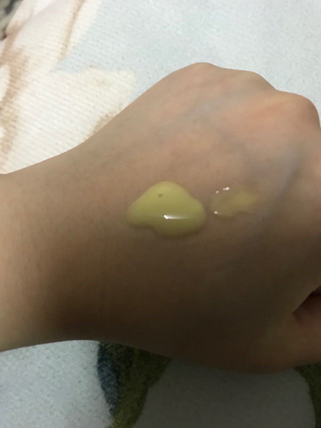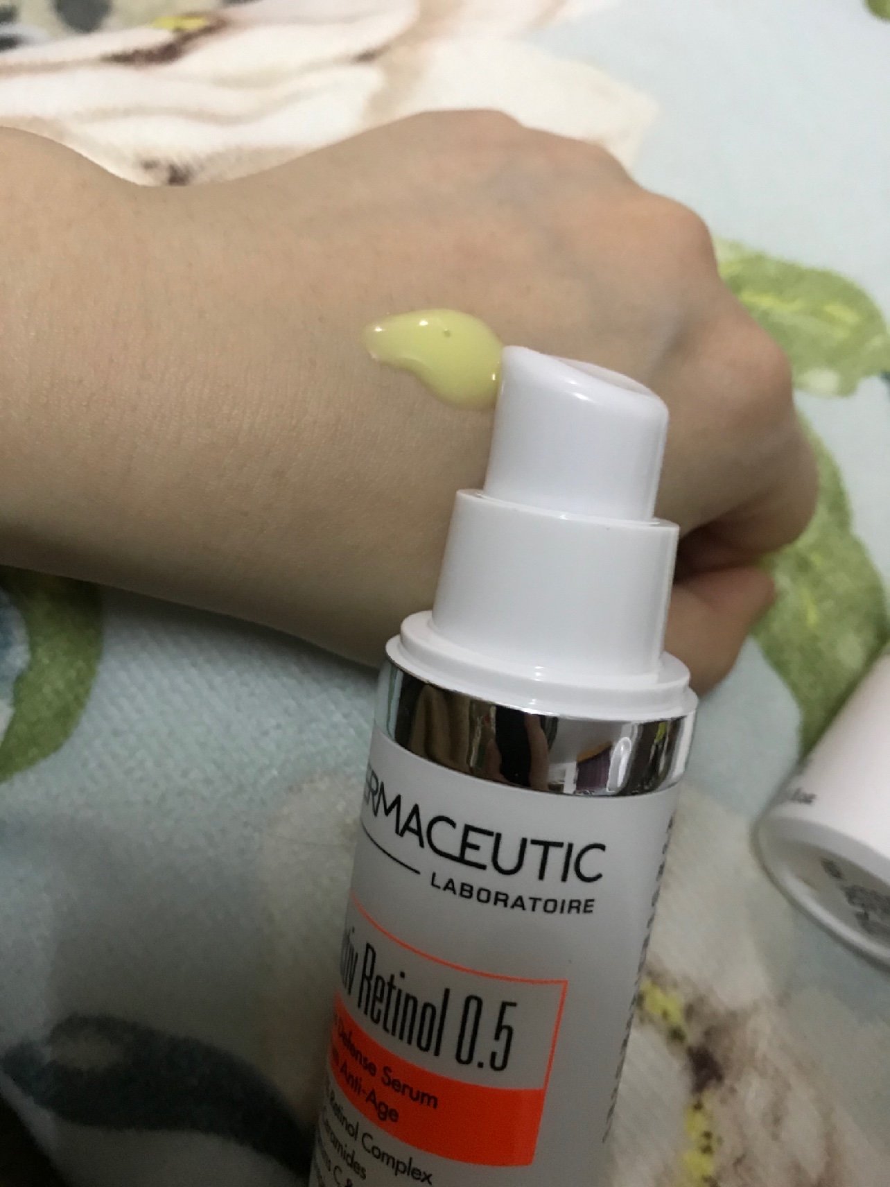 (2)使用矮的那个橘黄色瓶子——迪玛丝缇活力青春精华液。一泵的量,黄豆粒大小,皮肤薄薄涂一层,抹开。