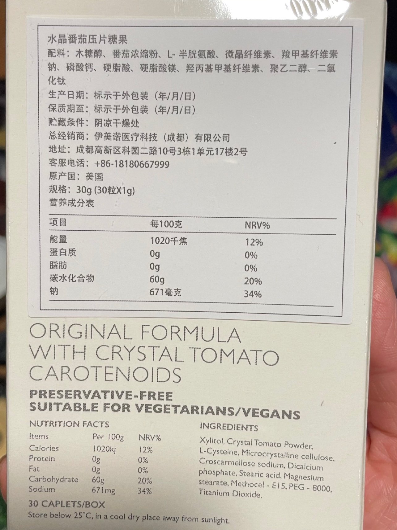 【产品成分】根据介绍和包装盒上的产品成分可以看出,口服糖丸主要有效成分是800mg 番茄浓缩粉,50mg L-半胱氨酸,其余成分则是压片辅助材料,与日常口服的维生素复合剂的辅料类似,证明都是食用级材料。