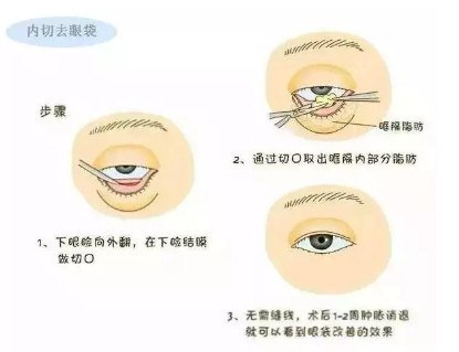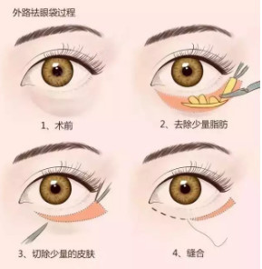 采取隐蔽切口方式,沿下睑睫毛下缘至外眦沟,经切口分离后切除膨出的眼袋脂肪,消除较明显的皮肤突起。