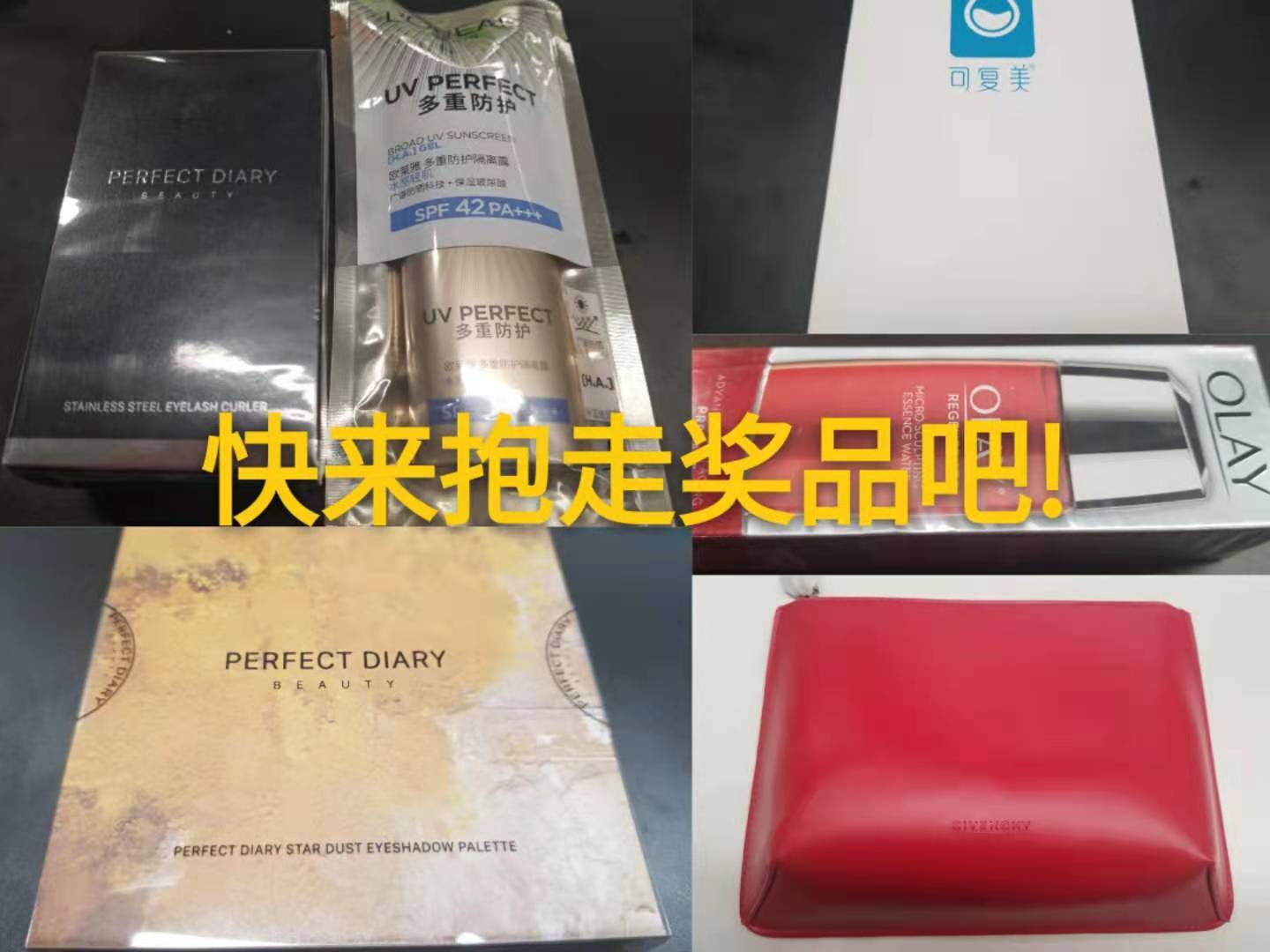 奖励2:纪梵希化妆包、olay大红瓶、完美日记眼影盘、可复美面膜、完美日记口红